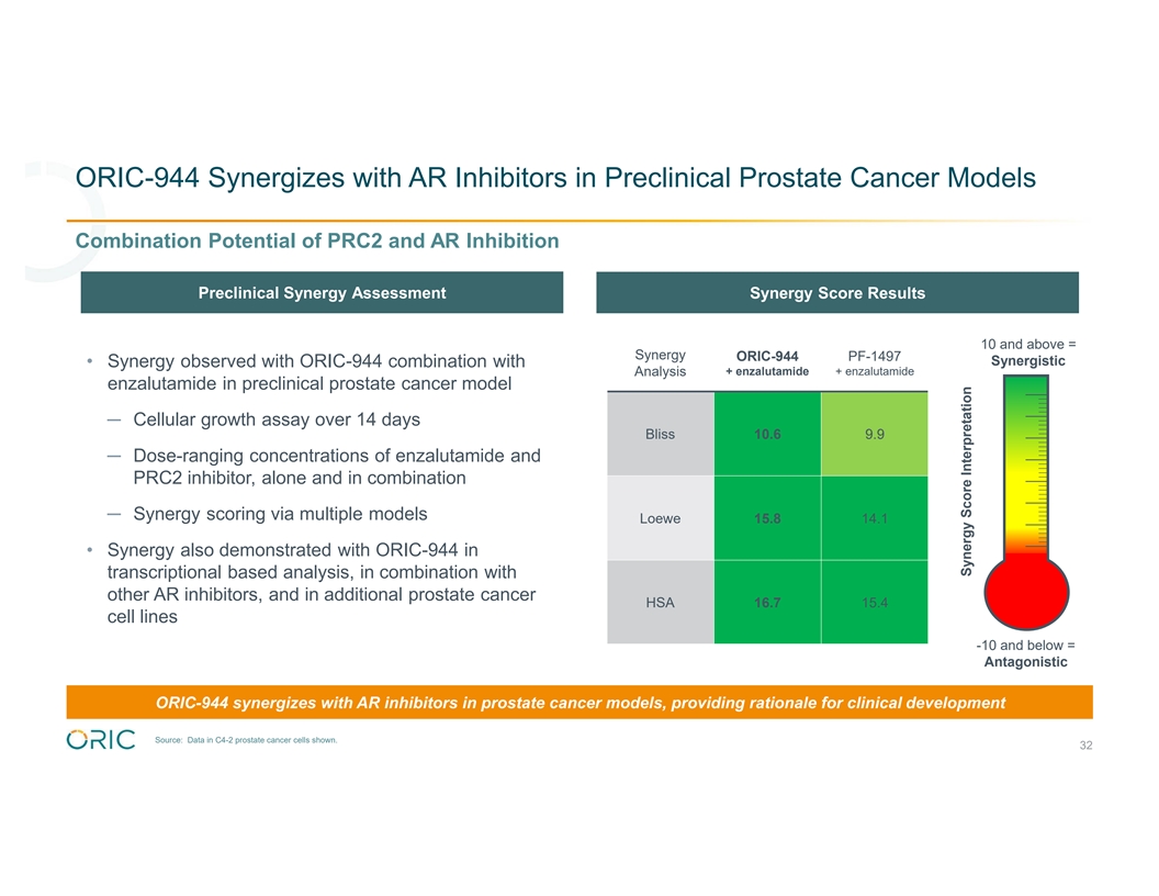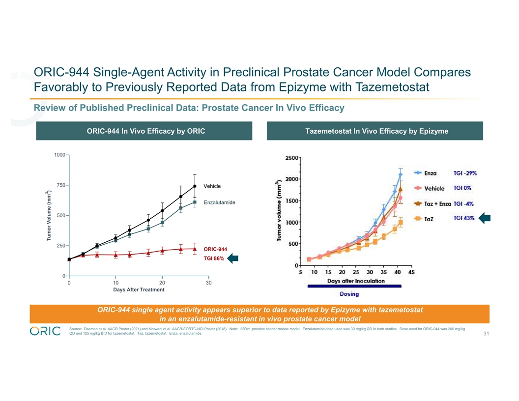 ORIC-944 Single-Agent Activity in Preclinical Prostate Cancer Model Compares Favorably to Previously Reported Data from Epizyme with Tazemetostat Review of Published Preclinical Data: Prostate Cancer In Vivo Efficacy ORIC-944 In Vivo Efficacy by ORIC Tazemetostat In Vivo Efficacy by Epizyme 1000 750 Vehicle Enzalutamide 500 250 ORIC-944 TGI 86% 0 0 10 20 30 Days After Treatment ORIC-944 single agent activity appears superior to data reported by Epizyme with tazemetostat in an enzalutamide-resistant in vivo prostate cancer model Source: Daemen et al. AACR Poster (2021) and Motwani et al. AACR-EORTC-NCI Poster (2018). Note: 22Rv1 prostate cancer mouse model. Enzalutamide dose used was 30 mg/kg QD in both studies. Dose used for ORIC-944 was 200 mg/kg QD and 125 mg/kg BID for tazemetostat. Taz, tazemetostat. Enza, enzalutamide. 31 3 Tumor Volume (mm )
