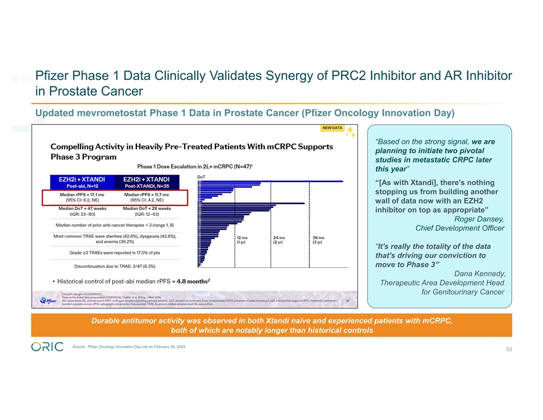 Pfizer Phase 1 Data Clinically Validates Synergy of PRC2 Inhibitor and AR Inhibitor in Prostate Cancer Updated mevrometostat Phase 1 Data in Prostate Cancer (Pfizer Oncology Innovation Day) “Based on the strong signal, we are planning to initiate two pivotal studies in metastatic CRPC later this year” “[As with Xtandi], there's nothing stopping us from building another wall of data now with an EZH2 inhibitor on top as appropriate” Roger Dansey, Chief Development Officer “It's really the totality of the data that's driving our conviction to move to Phase 3” Dana Kennedy, Therapeutic Area Development Head for Genitourinary Cancer Durable antitumor activity was observed in both Xtandi naïve and experienced patients with mCRPC, both of which are notably longer than historical controls Source: Pfizer Oncology Innovation Day call on February 29, 2024. 33