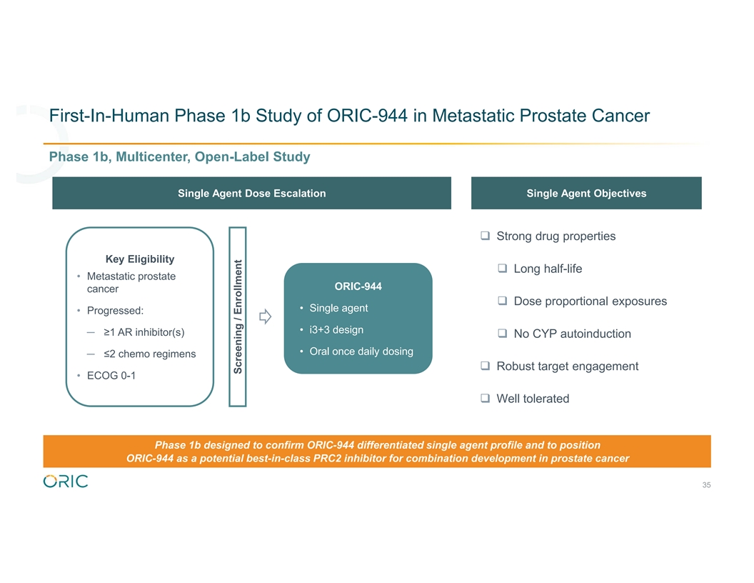 ORIC-944 Increases Progression-Free Survival in Combination with AR Inhibitor in Prostate Cancer Xenograft Tumors Progression-Free Survival in Prostate Cancer In Vivo Model 100 Vehicle Darolutamide Mevrometostat + Darolutamide ORIC-944 50 + Darolutamide 0 0 10 20 30 40 Days Post Treatment Mevrometostat + ORIC-944 + Vehicle Darolutamide Darolutamide Darolutamide Median survival (days) 11 12.5 24.5 Not reached ORIC-944 combination with darolutamide improves progression-free survival in a treatment refractory setting in vivo Note: C4-2 model grown in castrated mice. Darolutamide 50 mg/kg BID, mevrometostat 100 mg/kg BID, and ORIC-944 100 mg/kg QD. No drug-related tolerability issues. Progression event for either tumor volume >800 mm3 or morbidity. 34 Progression-Free Survival (%)