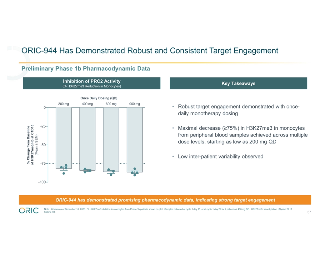 ORIC-944 Has Demonstrated a Potential Best-in-Class Pharmacokinetic Profile Preliminary Phase 1b Pharmacokinetic Data Clinical Half-Life Comparison Key Takeaways • Excellent pharmacokinetic profile observed to date ─ Increased exposure with dose level ─ Low inter-patient variability • No signs of CYP autoinduction that is observed with first-generation PRC2 inhibitors • Clinical half-life of ~20 hours is superior to other PRC2 inhibitors and supports QD dosing • Exposures at ≥600 mg QD exceed target Cmin that provides 90% TGI in preclinical in vivo prostate cancer models Lack of CYP ûüü Autoinduction Dose exploration continues with favorable plasma half-life and exposures consistent with best-in-class drug properties Note: All data as of December 10, 2023. Source: Tazemetostat half-life from FDA label. Mevrometostat half-life estimated from Schweizer et al. ESMO Poster (2022). 36 Clinical Half-life (hours)