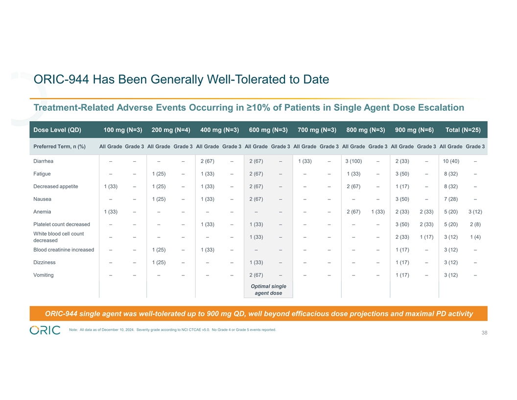 ORIC-944 Has Been Generally Well-Tolerated to Date Treatment-Related Adverse Events Occurring in ≥10% of Patients in Single Agent Dose Escalation Dose Level (QD) 100 mg (N=3) 200 mg (N=4) 400 mg (N=3) 600 mg (N=3) 700 mg (N=3) 800 mg (N=3) 900 mg (N=6) Total (N=25) Preferred Term, n (%) All Grade Grade 3 All Grade Grade 3 All Grade Grade 3 All Grade Grade 3 All Grade Grade 3 All Grade Grade 3 All Grade Grade 3 All Grade Grade 3 Diarrhea – – – – 2 (67) – 2 (67) – 1 (33) – 3 (100) – 2 (33) – 10 (40) – Fatigue – – 1 (25) – 1 (33) – 2 (67) – – – 1 (33) – 3 (50) – 8 (32) – Decreased appetite 1 (33) – 1 (25) – 1 (33) – 2 (67) – – – 2 (67) – 1 (17) – 8 (32) – Nausea – – 1 (25) – 1 (33) – 2 (67) – – – – – 3 (50) – 7 (28) – Anemia 1 (33) – – – – – – – – – 2 (67) 1 (33) 2 (33) 2 (33) 5 (20) 3 (12) Platelet count decreased – – – – 1 (33) – 1 (33) – – – – – 3 (50) 2 (33) 5 (20) 2 (8) White blood cell count – – – – – – 1 (33) – – – – – 2 (33) 1 (17) 3 (12) 1 (4) decreased Blood creatinine increased – – 1 (25) – 1 (33) – – – – – – – 1 (17) – 3 (12) – Dizziness – – 1 (25) – – – 1 (33) – – – – – 1 (17) – 3 (12) – Vomiting – – – – – – 2 (67) – – – – – 1 (17) – 3 (12) – Optimal single agent dose ORIC-944 single agent was well-tolerated up to 900 mg QD, well beyond efficacious dose projections and maximal PD activity Note: All data as of December 10, 2024. Severity grade according to NCI CTCAE v5.0. No Grade 4 or Grade 5 events reported. 38
