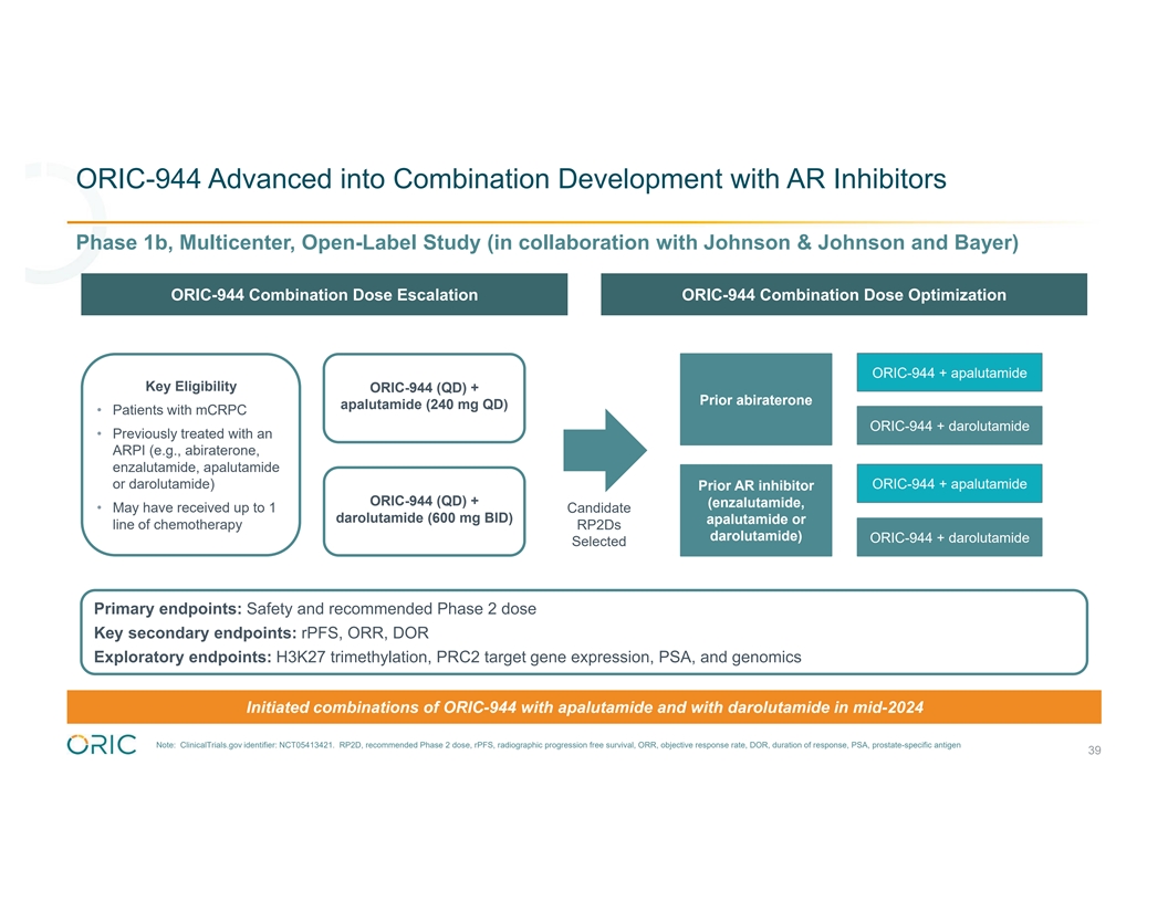 ORIC-944 Advanced into Combination Development with AR Inhibitors Phase 1b, Multicenter, Open-Label Study (in collaboration with Johnson & Johnson and Bayer) ORIC-944 Combination Dose Escalation ORIC-944 Combination Dose Optimization ORIC-944 + apalutamide Key Eligibility ORIC-944 (QD) + Prior abiraterone apalutamide (240 mg QD) • Patients with mCRPC ORIC-944 + darolutamide • Previously treated with an ARPI (e.g., abiraterone, enzalutamide, apalutamide or darolutamide) ORIC-944 + apalutamide Prior AR inhibitor ORIC-944 (QD) + (enzalutamide, • May have received up to 1 Candidate darolutamide (600 mg BID) apalutamide or line of chemotherapy RP2Ds darolutamide) ORIC-944 + darolutamide Selected Primary endpoints: Safety and recommended Phase 2 dose Key secondary endpoints: rPFS, ORR, DOR Exploratory endpoints: H3K27 trimethylation, PRC2 target gene expression, PSA, and genomics Initiated combinations of ORIC-944 with apalutamide and with darolutamide in mid-2024 Note: ClinicalTrials.gov identifier: NCT05413421. RP2D, recommended Phase 2 dose, rPFS, radiographic progression free survival, ORR, objective response rate, DOR, duration of response, PSA, prostate-specific antigen 39