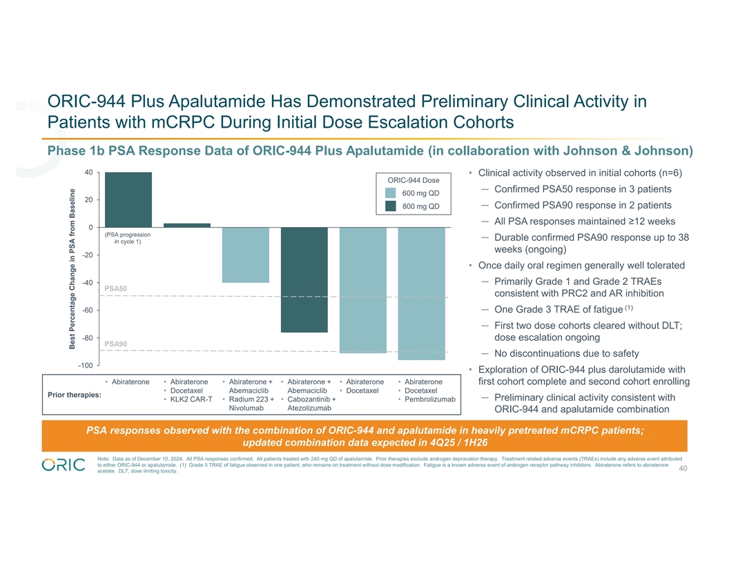 ORIC-944 Plus Apalutamide Has Demonstrated Preliminary Clinical Activity in Patients with mCRPC During Initial Dose Escalation Cohorts Phase 1b PSA Response Data of ORIC-944 Plus Apalutamide (in collaboration with Johnson & Johnson) 40 • Clinical activity observed in initial cohorts (n=6) ORIC-944 Dose ─ Confirmed PSA50 response in 3 patients 600 mg QD 20 800 mg QD ─ Confirmed PSA90 response in 2 patients ─ All PSA responses maintained ≥12 weeks 0 (PSA progression ─ Durable confirmed PSA90 response up to 38 in cycle 1) weeks (ongoing) -20 • Once daily oral regimen generally well tolerated -40 ─ Primarily Grade 1 and Grade 2 TRAEs PSA50 consistent with PRC2 and AR inhibition (1) -60 ─ One Grade 3 TRAE of fatigue ─ First two dose cohorts cleared without DLT; -80 dose escalation ongoing PSA90 ─ No discontinuations due to safety -100 • Exploration of ORIC-944 plus darolutamide with • Abiraterone • Abiraterone • Abiraterone + • Abiraterone + • Abiraterone • Abiraterone first cohort complete and second cohort enrolling • Docetaxel Abemaciclib Abemaciclib • Docetaxel • Docetaxel Prior therapies: ─ Preliminary clinical activity consistent with • KLK2 CAR-T • Radium 223 + • Cabozantinib + • Pembrolizumab Nivolumab Atezolizumab ORIC-944 and apalutamide combination PSA responses observed with the combination of ORIC-944 and apalutamide in heavily pretreated mCRPC patients; updated combination data expected in 4Q25 / 1H26 Note: Data as of December 10, 2024. All PSA responses confirmed. All patients treated with 240 mg QD of apalutamide. Prior therapies exclude androgen depravation therapy. Treatment related adverse events (TRAEs) include any adverse event attributed to either ORIC-944 or apalutamide. (1) Grade 3 TRAE of fatigue observed in one patient, who remains on treatment without dose modification. Fatigue is a known adverse event of androgen receptor pathway inhibitors. Abiraterone refers to abiraterone 40 acetate. DLT, dose limiting toxicity. Best Percentage Change in PSA from Baseline