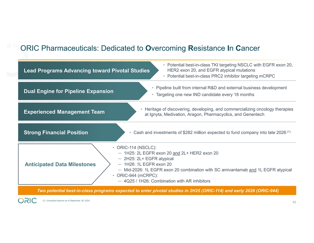 Clinical Pipeline Focused on Advancement of ORIC-114 and ORIC-944 Discovery / Clinical Anticipated Program Indication IND Enabling Phase 1/2 Pivotal / Phase 3 Collaboration Data Milestones PRODUCT CANDIDATES Mid-2026 • 1L combination with SC amivantamab EGFR exon 20 • 1L monotherapy 1H26 (1) NSCLC • 2L monotherapy 1H25 • 1L monotherapy Mid-2026 Atypical EGFR ORIC-114 NSCLC • 2L+ monotherapy 2H25 EGFR/HER2 inhibitor HER2 exon 20 • 2L+ monotherapy 1H25 NSCLC • Combination with apalutamide 4Q25 / 1H26 ORIC-944 Prostate Cancer PRC2 inhibitor • Combination with darolutamide 4Q25 / 1H26 DISCOVERY RESEARCH PROGRAMS Multiple programs targeting Solid tumors resistance mechanisms (1) Clinical collaboration with Johnson & Johnson to evaluate ORIC-114 plus subcutaneous (SC) amivantamab in patients with first-line NSCLC with EGFR exon 20 insertion mutations. 42