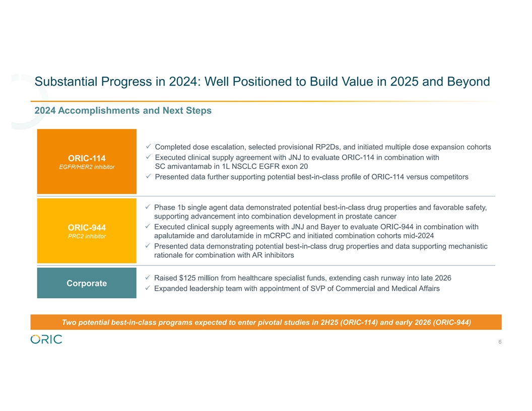 Clinical Pipeline Focused on Advancement of ORIC-114 and ORIC-944 Discovery / Clinical Anticipated Program Indication IND Enabling Phase 1/2 Pivotal / Phase 3 Collaboration Data Milestones PRODUCT CANDIDATES Mid-2026 • 1L combination with SC amivantamab EGFR exon 20 • 1L monotherapy 1H26 (1) NSCLC • 2L monotherapy 1H25 • 1L monotherapy Mid-2026 Atypical EGFR ORIC-114 NSCLC • 2L+ monotherapy 2H25 EGFR/HER2 inhibitor HER2 exon 20 • 2L+ monotherapy 1H25 NSCLC • Combination with apalutamide 4Q25 / 1H26 ORIC-944 Prostate Cancer PRC2 inhibitor • Combination with darolutamide 4Q25 / 1H26 DISCOVERY RESEARCH PROGRAMS Multiple programs targeting Solid tumors resistance mechanisms (1) Clinical collaboration with Johnson & Johnson to evaluate ORIC-114 plus subcutaneous (SC) amivantamab in patients with first-line NSCLC with EGFR exon 20 insertion mutations. 5