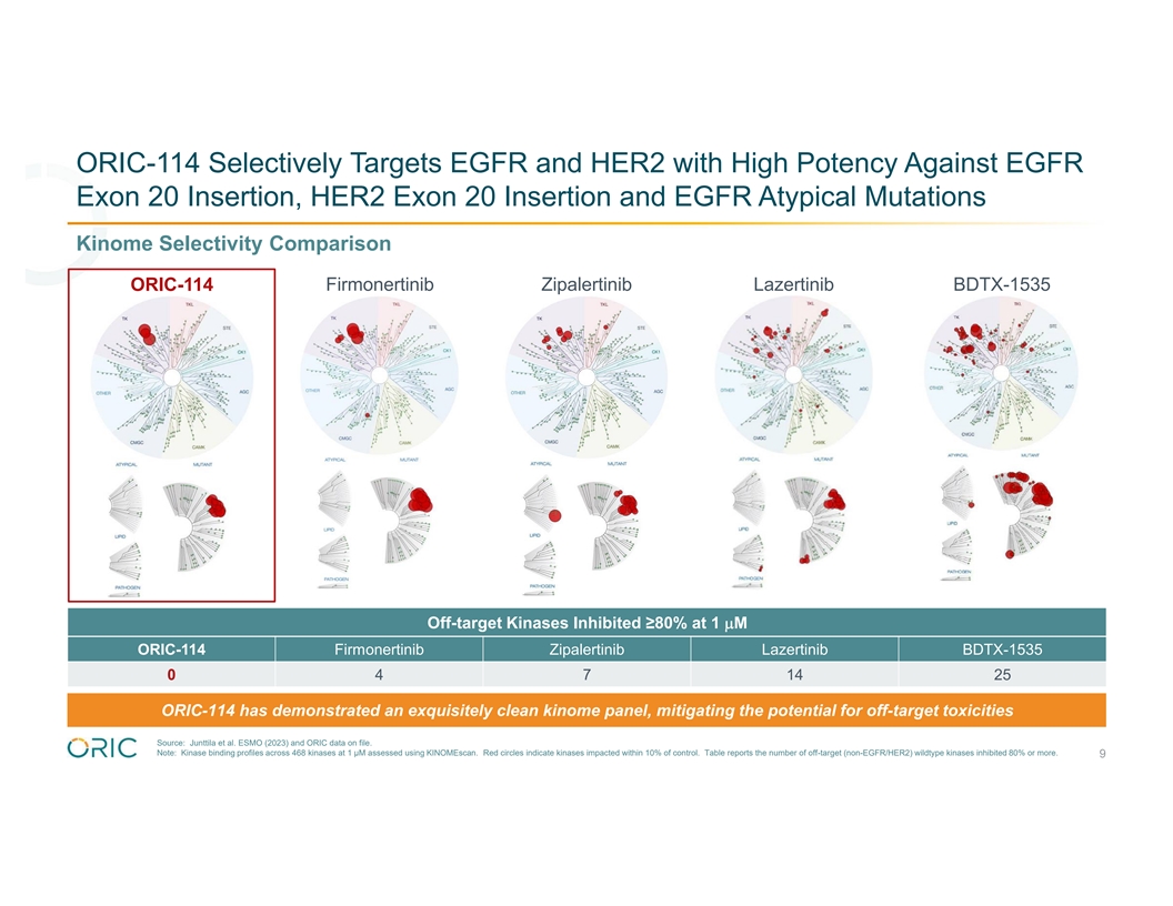 ORIC-114: Potential Best-in-Class TKI to Overcome Limitations of Approved and Investigational Agents for EGFR and HER2 Mutated NSCLC KEY LIMITATIONS of approved and investigational agents • Lack of CNS activity in populations with high rate of CNS metastases leads to suboptimal clinical outcomes • Tolerability issues with high rates of treatment discontinuations due to on- and off-target toxicity ORIC-114 may address these limitations • Selectively targets EGFR and HER2 with high potency against exon 20 insertion and atypical mutations • Multiple confirmed responses observed in heavily pretreated NSCLC patients with EGFR and HER2 exon 20 • Demonstrated CNS activity including first ever confirmed CNS complete response in an EGFR exon 20 patient with untreated brain metastases • Well-tolerated with mostly Grade 1–2 TRAEs, low rates and severity of on-target rash and diarrhea, and minimal off- target toxicities STATUS of development • Enrolling three cohorts in 2L NSCLC: EGFR exon 20, HER2 exon 20, and EGFR atypical mutations • Initiating three cohorts in 1L NSCLC: EGFR atypical, EGFR exon 20 monotherapy and in combination with SC amivantamab (1) (in collaboration with Johnson & Johnson) • Six Phase 1b data readouts expected through mid-2026 ORIC-114 is a potential best-in-class therapy for NSCLC with excellent selectivity and brain penetrance that has demonstrated promising clinical proof-of-concept in heavily pretreated patients with active CNS metastases (1) Clinical collaboration with Johnson & Johnson to evaluate ORIC-114 plus subcutaneous (SC) amivantamab in 1L NSCLC patients with EGFR exon 20. 8