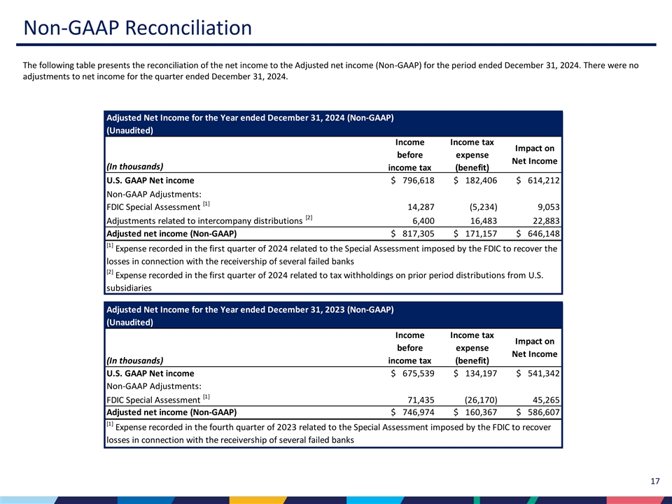 イグナシオ・アルバレス最高経営責任者(CEO)は次のように述べた:「第 4 四半期の業績は堅調で、当期純利益は 1 億 7,800 万ドルとなりました。力強い貸出増加を達成し、正味受取利息と正味受取利息マージンも引き続き増加しました。