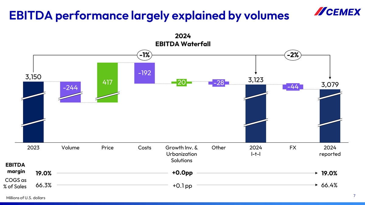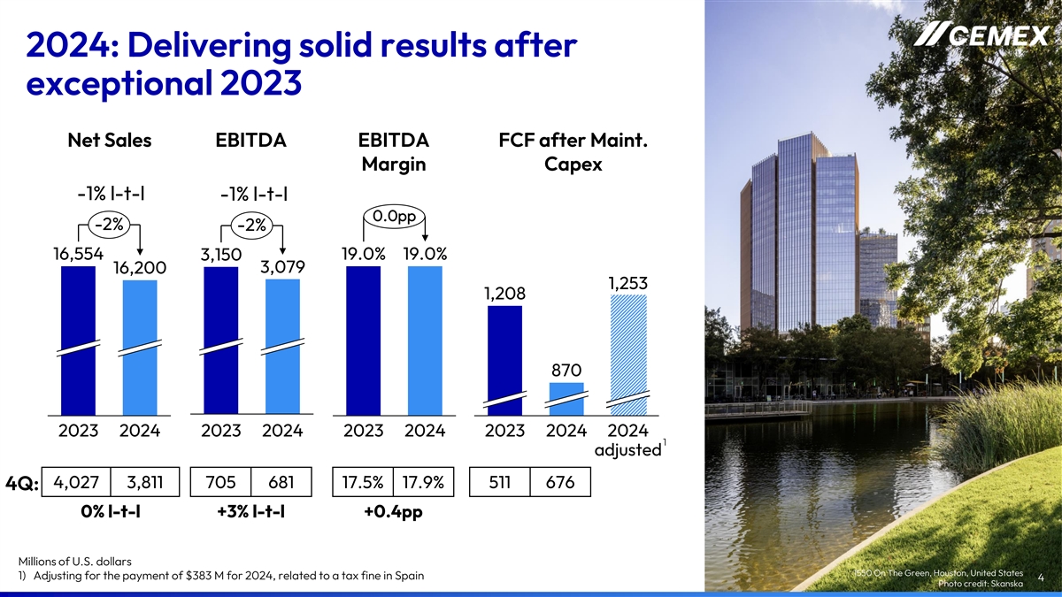 Analyst and Investor Relations - Monterrey This press release and the documents referred to herein include certain non-International Financial Reporting Standards (“IFRS”) financial measures that differ from financial information presented by Cemex in accordance with IFRS in its financial statements and reports containing financial information. The aforementioned non-IFRS financial measures include “Operating EBITDA (operating earnings before other expenses, net plus depreciation and amortization)” and “Operating EBITDA Margin”. The closest IFRS financial measure to Operating EBITDA is “Operating earnings before other expenses, net”, as Operating EBITDA adds depreciation and amortization to the IFRS financial measure. Our Operating EBITDA Margin is calculated by dividing our Operating EBITDA for the period by our revenues as reported in our financial statements. We believe there is no close IFRS financial measure to compare Operating EBITDA Margin. These non-IFRS financial measures are designed to complement and should not be considered superior to financial measures calculated in accordance with IFRS. Although Operating EBITDA and Operating EBITDA Margin are not measures of operating performance, an alternative to cash flows or a measure of financial position under IFRS, Operating EBITDA is the financial measure used by Cemex’s management to review operating performance and profitability, for decision-making purposes and to allocate resources. Moreover, our Operating EBITDA is a measure used by Cemex’s creditors to review our ability to internally fund capital expenditures, service or incur debt and comply with financial covenants under our financing agreements. Furthermore, Cemex’s management regularly reviews our Operating EBITDA Margin by reportable segment and on a consolidated basis as a measure of performance and profitability. These non-IFRS financial measures do not have any standardized meaning and are therefore unlikely to be comparable to similarly titled measures presented by other companies. Non-IFRS financial measures presented in the reports, presentations, and documents to be disclosed during Cemex’s fourth quarter 2024 results conference call and audio webcast presentation are being provided for informative purposes only and shall not be construed as investment, financial, or other advice.