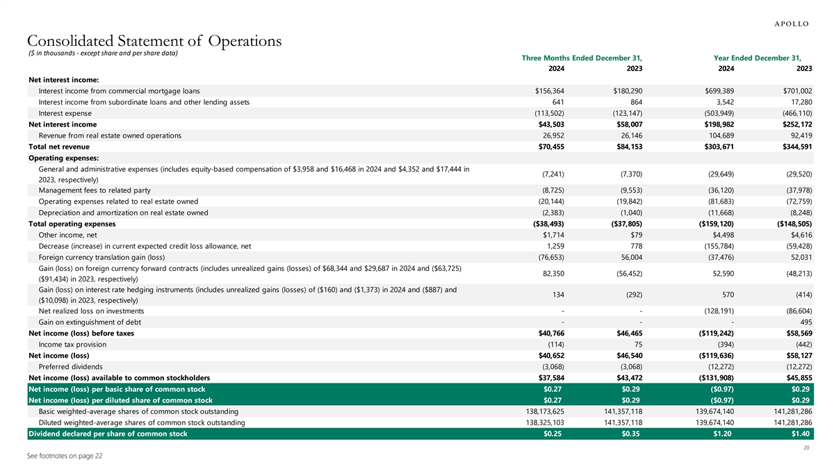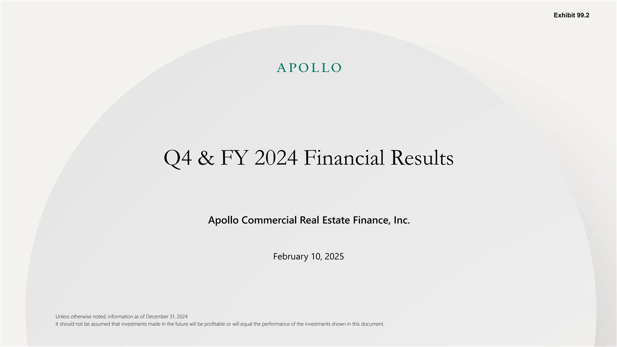 ニューヨーク州ニューヨーク、2025年2月10日-アポロ・コマーシャル・リアル・エステート・ファイナンス・インク(以下「当社」または「ARI」)(NYSE:ARI)は本日、2024年12月31日に終了した四半期および年度の業績を発表した。