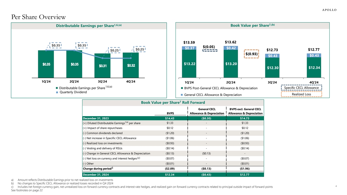 2024年12月31日に終了した四半期および通年の希薄化後普通株式1株当たり普通株主に帰属する当期純利益(損失)は、それぞれ0.27ドルおよび(0.97ドル)でした。2024年12月31日に終了した四半期および通年の希薄化後普通株式1株当たり分配可能利益(以下に定義する非GAAP財務指標)および正味実現投資損失調整前の分配可能利益は、それぞれ0.32ドルおよび0.32ドル、0.43ドルおよび1.33ドルでした。