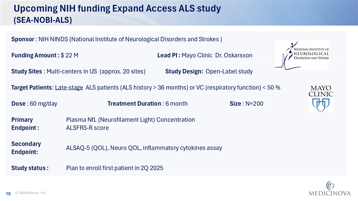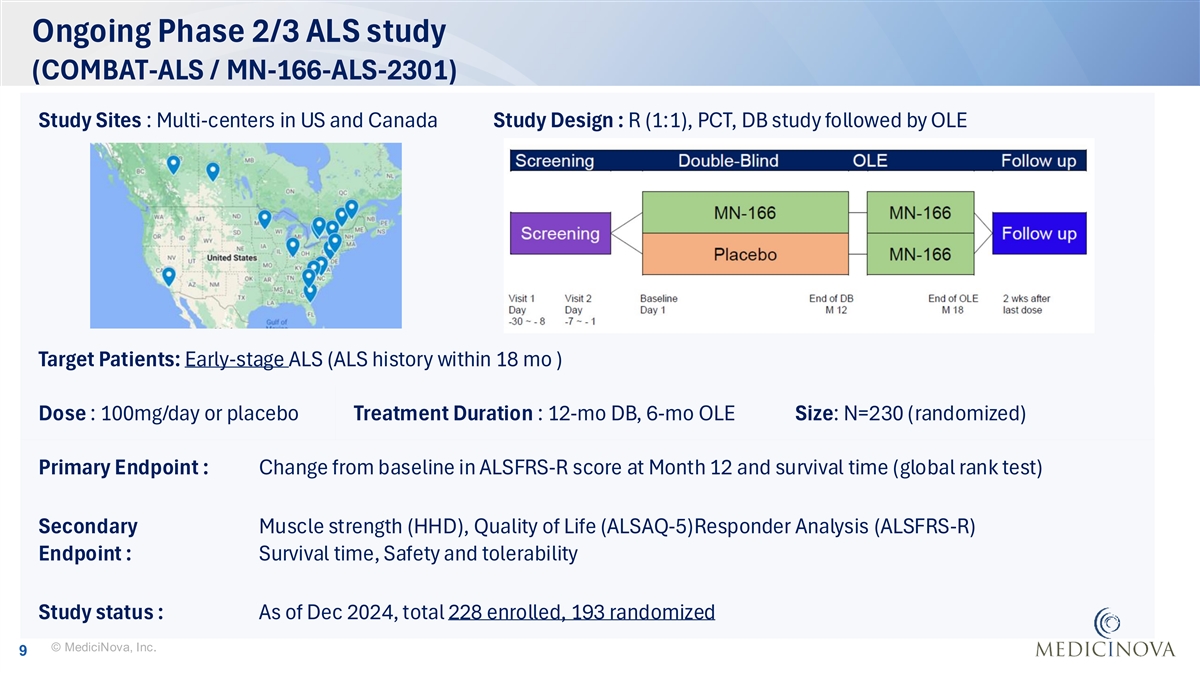Ongoing Phase 2/3 ALS study (COMBAT-ALS / MN-166-ALS-2301) Study Sites : Multi-centers in US and Canada Study Design : R (1:1), PCT, DB study followed by OLE Target Patients: Early-stage ALS (ALS history within 18 mo ) Dose : 100mg/day or placebo Treatment Duration : 12-mo DB, 6-mo OLE Size: N=230 (randomized) Primary Endpoint : Change from baseline in ALSFRS-R score at Month 12 and survival time (global rank test) Secondary Muscle strength (HHD), Quality of Life (ALSAQ-5)Responder Analysis (ALSFRS-R) Endpoint : Survival time, Safety and tolerability Study status : As of Dec 2024, total 228 enrolled, 193 randomized © MediciNova, Inc. 9