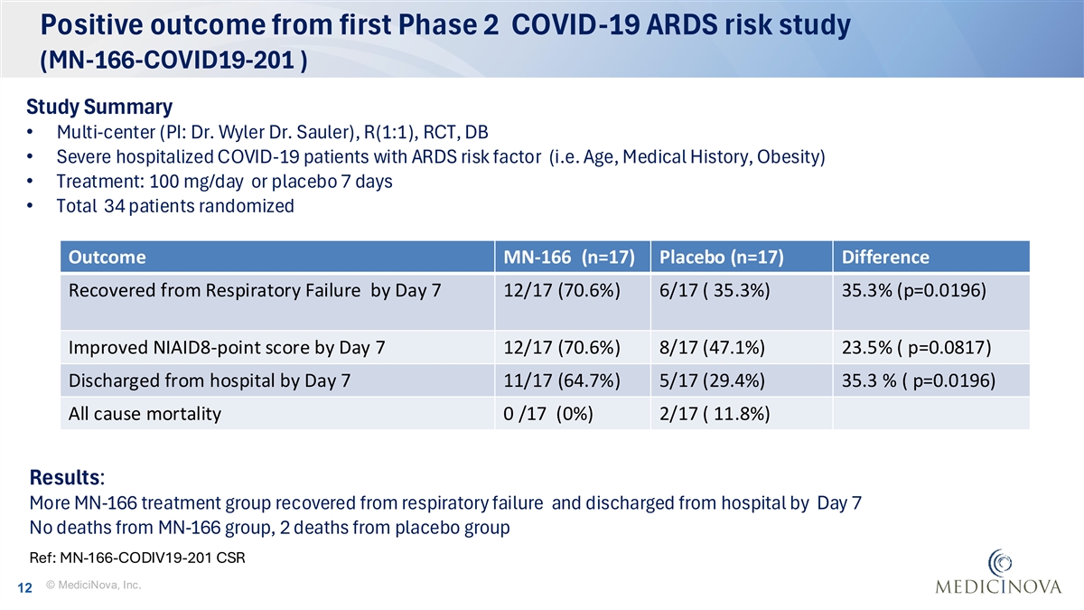 Positive outcome from first Phase 2 COVID-19 ARDS risk study (MN-166-COVID19-201 ) Study Summary • Multi-center (PI: Dr. Wyler Dr. Sauler), R(1:1), RCT, DB • Severe hospitalized COVID-19 patients with ARDS risk factor (i.e. Age, Medical History, Obesity) • Treatment: 100 mg/day or placebo 7 days • Total 34 patients randomized Outcome MN-166 (n=17) Placebo (n=17) Difference Recovered from Respiratory Failure by Day 7 12/17 (70.6%) 6/17 ( 35.3%) 35.3% (p=0.0196) Improved NIAID8-point score by Day 7 12/17 (70.6%) 8/17 (47.1%) 23.5% ( p=0.0817) Discharged from hospital by Day 7 11/17 (64.7%) 5/17 (29.4%) 35.3 % ( p=0.0196) All cause mortality 0 /17 (0%) 2/17 ( 11.8%) Results: More MN-166 treatment group recovered from respiratory failure and discharged from hospital by Day 7 No deaths from MN-166 group, 2 deaths from placebo group Ref: MN-166-CODIV19-201 CSR © MediciNova, Inc. 12