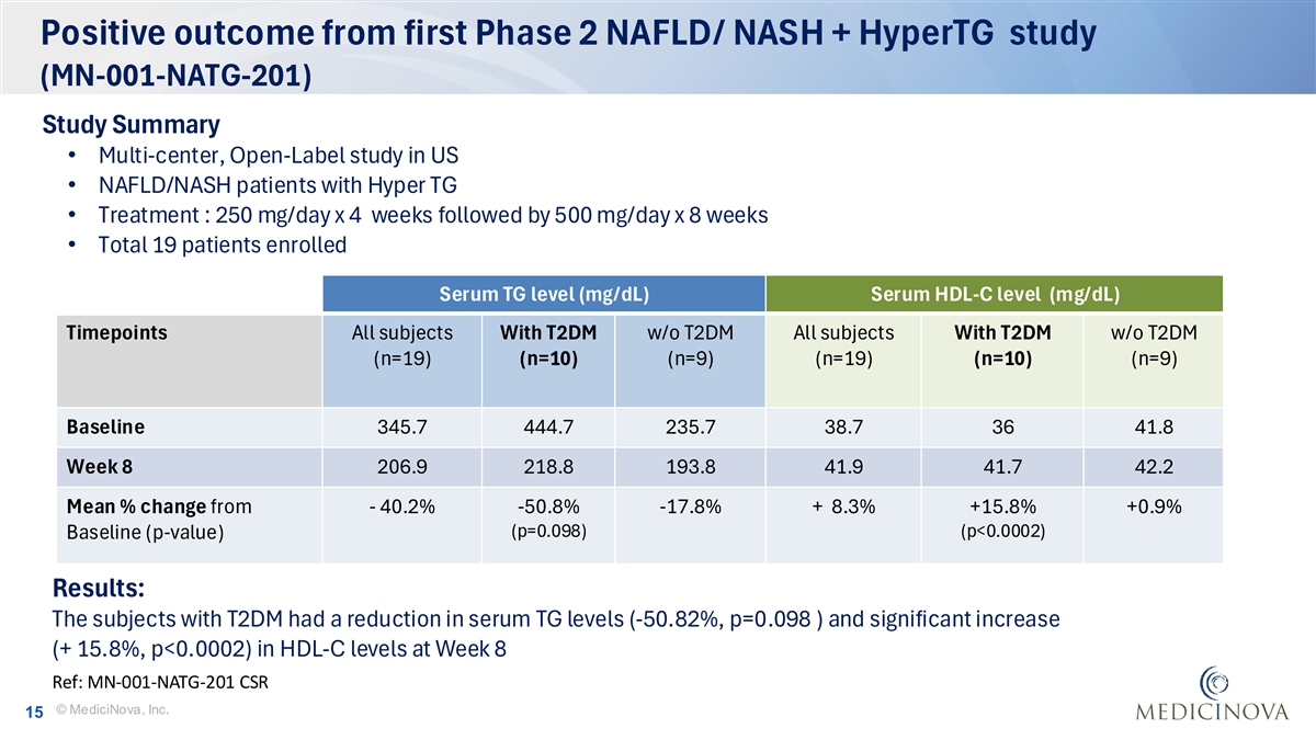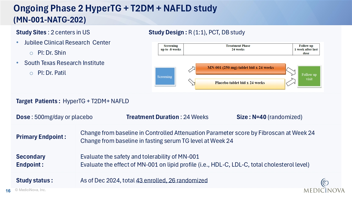 Positive outcome from first Phase 2 NAFLD/ NASH + HyperTG study (MN-001-NATG-201) Study Summary • Multi-center, Open-Label study in US • NAFLD/NASH patients with Hyper TG • Treatment : 250 mg/day x 4 weeks followed by 500 mg/day x 8 weeks • Total 19 patients enrolled Serum TG level (mg/dL) Serum HDL-C level (mg/dL) Timepoints All subjects With T2DM w/o T2DM All subjects With T2DM w/o T2DM (n=19) (n=10) (n=9) (n=19) (n=10) (n=9) Baseline 345.7 444.7 235.7 38.7 36 41.8 Week 8 206.9 218.8 193.8 41.9 41.7 42.2 Mean % change from - 40.2% -50.8% -17.8% + 8.3% +15.8% +0.9% (p=0.098) (p<0.0002) Baseline (p-value) Results: The subjects with T2DM had a reduction in serum TG levels (-50.82%, p=0.098 ) and significant increase (+ 15.8%, p<0.0002) in HDL-C levels at Week 8 Ref: MN-001-NATG-201 CSR © MediciNova, Inc. 15