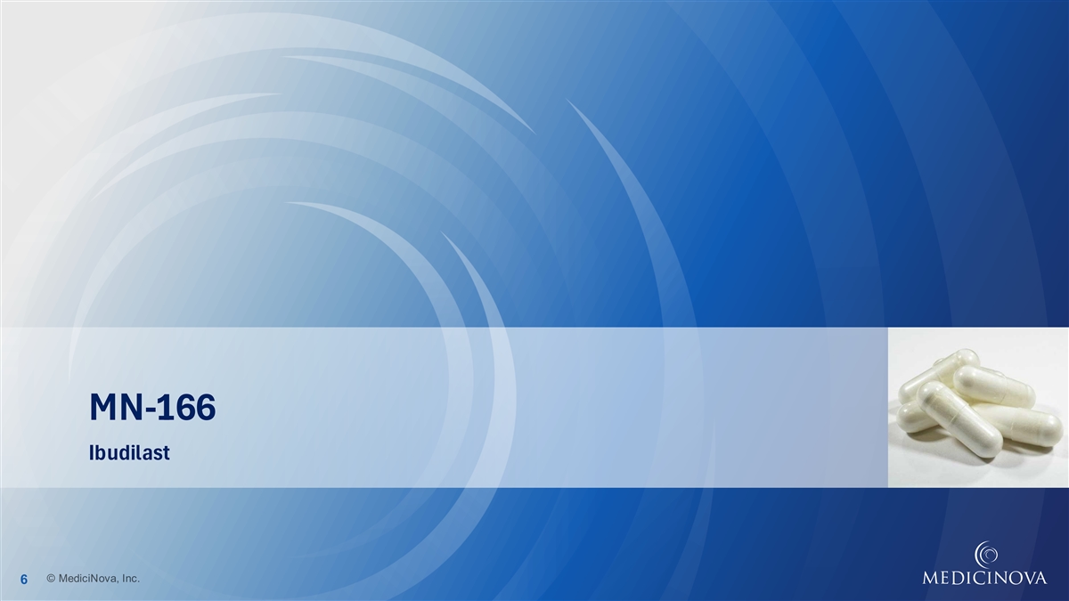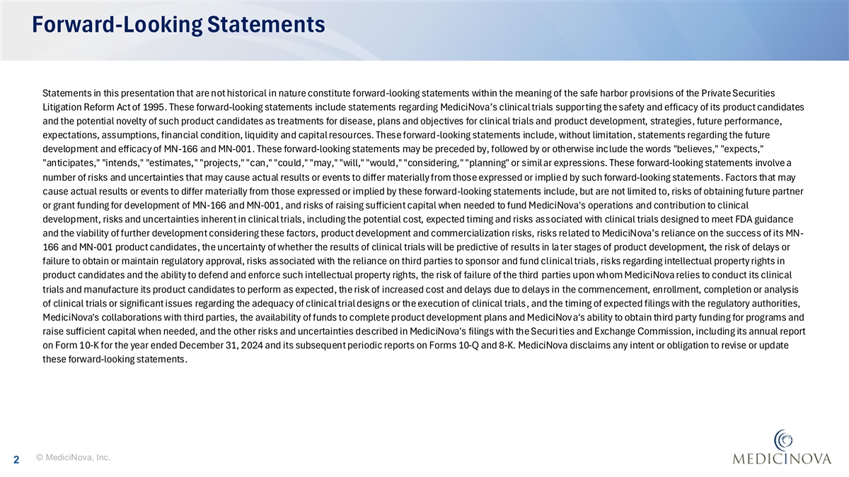 Forward-Looking Statements Statements in this presentation that are not historical in nature constitute forward-looking statements within the meaning of the safe harbor provisions of the Private Securities Litigation Reform Act of 1995. These forward-looking statements include statements regarding MediciNova’s clinical trials supporting the safety and efficacy of its product candidates and the potential novelty of such product candidates as treatments for disease, plans and objectives for clinical trials and product development, strategies, future performance, expectations, assumptions, financial condition, liquidity and capital resources. These forward-looking statements include, without limitation, statements regarding the future development and efficacy of MN-166 and MN-001. These forward-looking statements may be preceded by, followed by or otherwise include the words believes, expects, anticipates, intends, estimates, projects, can, could, may, will, would, considering, planning or simil ar expressions. These forward-looking statements involve a number of risks and uncertainties that may cause actual results or events to differ materially from those expressed or implied by such forward-looking statements. Factors that may cause actual results or events to differ materially from those expressed or implied by these forward-looking statements include, but are not limited to, risks of obtaining future partner or grant funding for development of MN-166 and MN-001, and risks of raising sufficient capital when needed to fund MediciNova's operations and contribution to clinical development, risks and uncertainties inherent in clinical trials, including the potential cost, expected timing and risks associated with clinical trials designed to meet FDA guidance and the viability of further development considering these factors, product development and commercialization risks, risks related to MediciNova’s reliance on the success of its MN- 166 and MN-001 product candidates, the uncertainty of whether the results of clinical trials will be predictive of results in la ter stages of product development, the risk of delays or failure to obtain or maintain regulatory approval, risks associated with the reliance on third parties to sponsor and fund clinical trials, risks regarding intellectual property rights in product candidates and the ability to defend and enforce such intellectual property rights, the risk of failure of the third parties upon whom MediciNova relies to conduct its clinical trials and manufacture its product candidates to perform as expected, the risk of increased cost and delays due to delays in the commencement, enrollment, completion or analysis of clinical trials or significant issues regarding the adequacy of clinical trial designs or the execution of clinical trials, and the timing of expected filings with the regulatory authorities, MediciNova's collaborations with third parties, the availability of funds to complete product development plans and MediciNov a's ability to obtain third party funding for programs and raise sufficient capital when needed, and the other risks and uncertainties described in MediciNova's filings with the Securi ties and Exchange Commission, including its annual report on Form 10-K for the year ended December 31, 2024 and its subsequent periodic reports on Forms 10-Q and 8-K. MediciNova disclaims any intent or obligation to revise or update these forward-looking statements. © MediciNova, Inc. 2