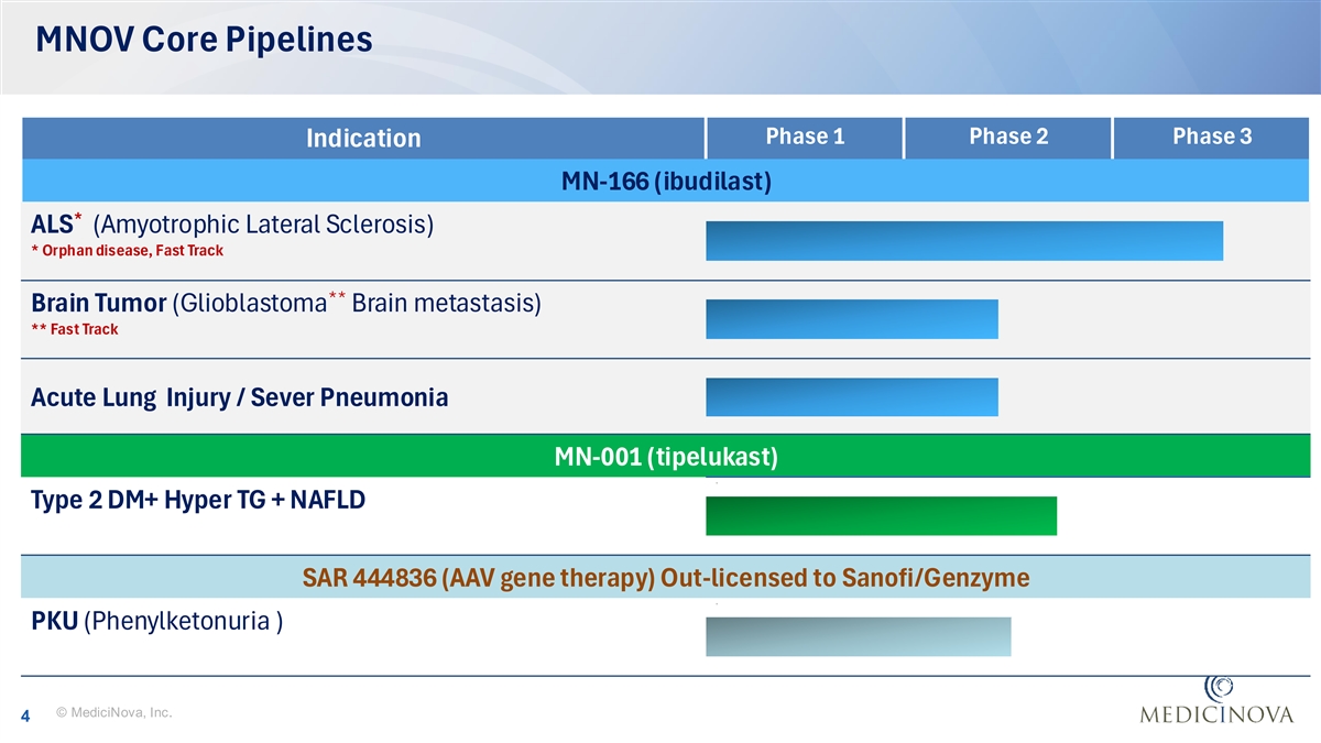 MediciNova Overview ✓ US Office: San Diego; Japan Office: Tokyo • Dual listed in TSE JASDAQ (4875) and NASDAQ (MNOV) ✓ Biopharma company developing late-stage drug candidate • Multiple late-stage pipelines (Phase 2/3, Phase 2) • Well-established safety profile ✓ Focused on unmet medical needs • MN-166 (ibudilast):Neurodegenerative disease, Brain tumor • MN-001(tipelukast): Metabolic diseases (Hyperlipidemia/T2DM, NAFLD (MAFLD)) ✓ Capital efficient model • Operating cash burn ~ $12 M/year • Royalty income from out-licensed program (Sanofi/Genzyme) • Majority funding for MNOV Clinical trials have been sponsored by the US and/or other government agencies. © MediciNova, Inc. 3