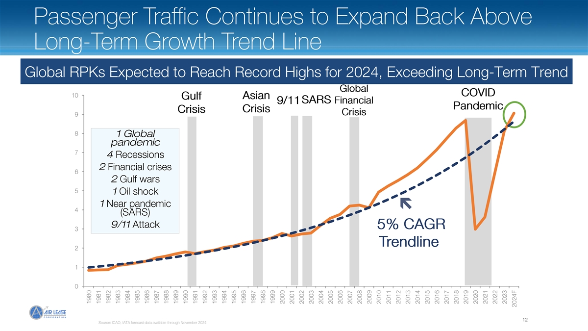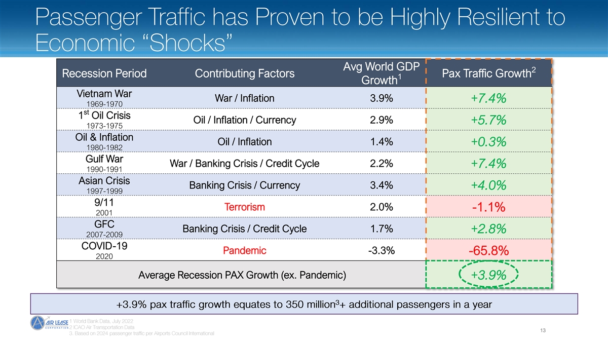 Avg World GDP 2 Recession Period Contributing Factors Pax Traffic Growth 1 Growth Vietnam War War / Inflation 3.9% +7.4% 1969-1970 st 1 Oil Crisis Oil / Inflation / Currency 2.9% +5.7% 1973-1975 Oil & Inflation Oil / Inflation 1.4% +0.3% 1980-1982 Gulf War War / Banking Crisis / Credit Cycle 2.2% +7.4% 1990-1991 Asian Crisis Banking Crisis / Currency 3.4% +4.0% 1997-1999 9/11 Terrorism 2.0% -1.1% 2001 GFC Banking Crisis / Credit Cycle 1.7% +2.8% 2007-2009 COVID-19 Pandemic -3.3% -65.8% 2020 Average Recession PAX Growth (ex. Pandemic) +3.9% 13
