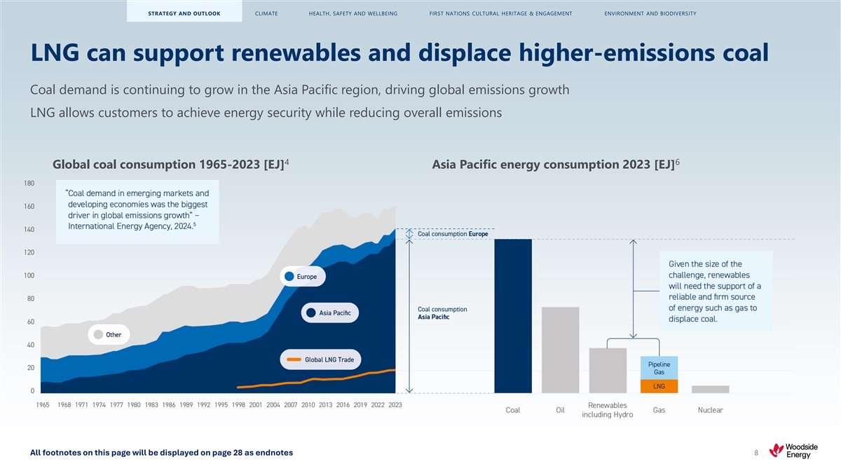 SSTTR RA AT TE EG GY Y A AN ND D O OU UT TLLO OO OK K CLIMATE HEALTH, SAFETY AND WELLBEING FIRST NATIONS CULTURAL HERITAGE & ENGAGEMENT ENVIRONMENT AND BIODIVERSITY LNG can support renewables and displace higher-emissions coal Coal demand is continuing to grow in the Asia Pacific region, driving global emissions growth LNG allows customers to achieve energy security while reducing overall emissions 4 6 Global coal consumption 1965-2023 [EJ] Asia Pacific energy consumption 2023 [EJ] All footnotes on this page will be displayed on page 28 as endnotes 8