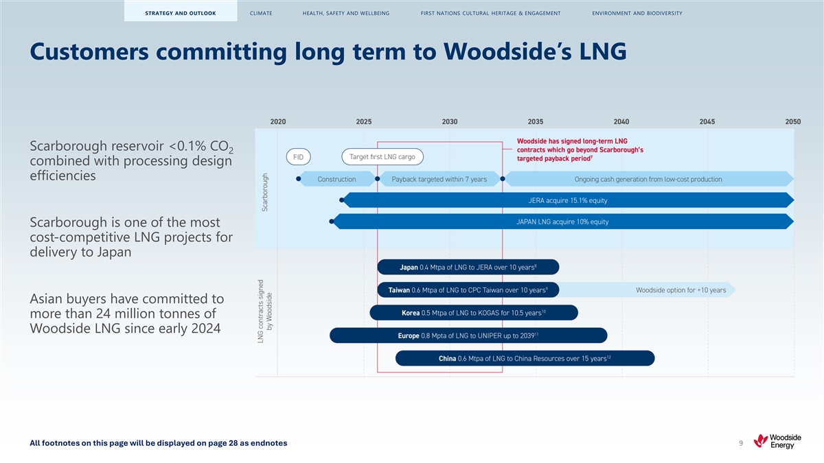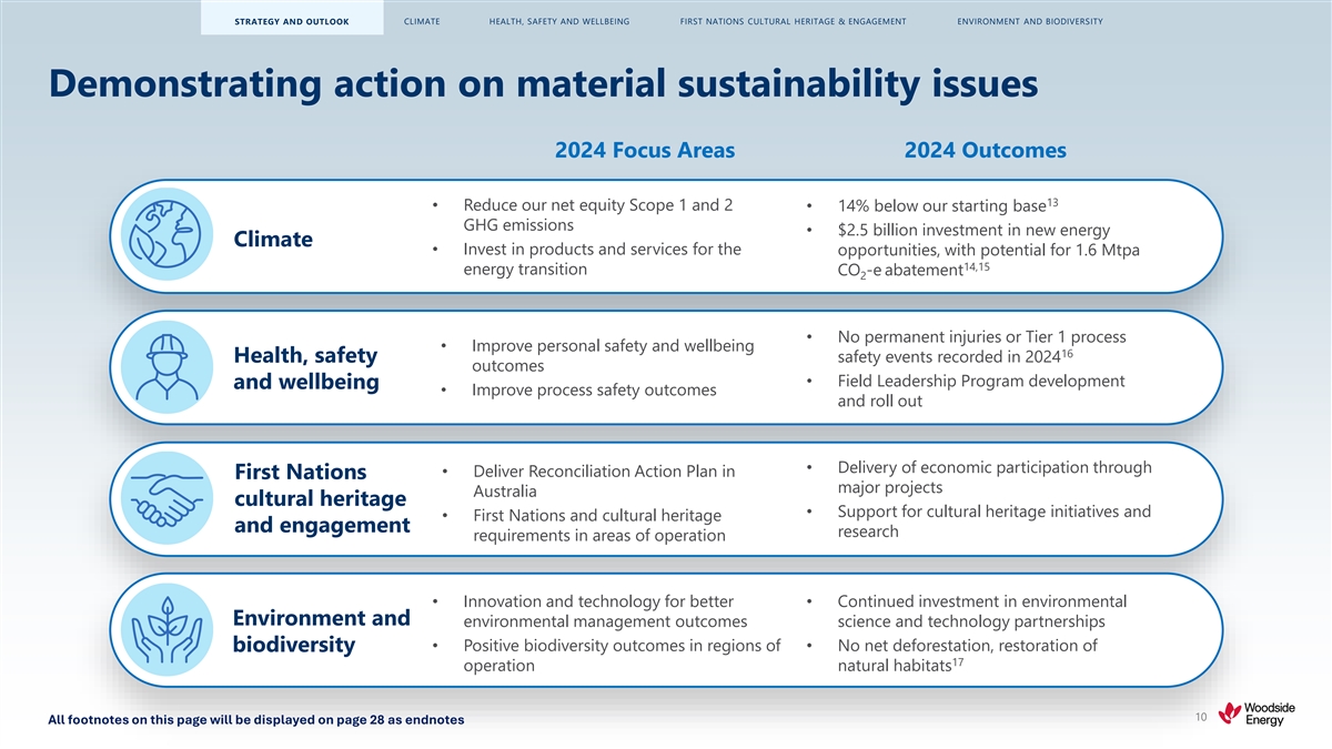 SSTTR RA AT TE EG GY Y A AN ND D O OU UT TLLO OO OK K CLIMATE HEALTH, SAFETY AND WELLBEING FIRST NATIONS CULTURAL HERITAGE & ENGAGEMENT ENVIRONMENT AND BIODIVERSITY Customers committing long term to Woodside’s LNG Scarborough reservoir <0.1% CO 2 combined with processing design efficiencies Scarborough is one of the most cost-competitive LNG projects for delivery to Japan Asian buyers have committed to more than 24 million tonnes of Woodside LNG since early 2024 All footnotes on this page will be displayed on page 28 as endnotes 9