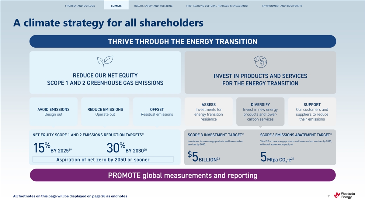 STRATEGY AND OUTLOOK C CL LIIM MA A TT EE HEALTH, SAFETY AND WELLBEING FIRST NATIONS CULTURAL HERITAGE & ENGAGEMENT ENVIRONMENT AND BIODIVERSITY A climate strategy for all shareholders All footnotes on this page will be displayed on page 28 as endnotes 11