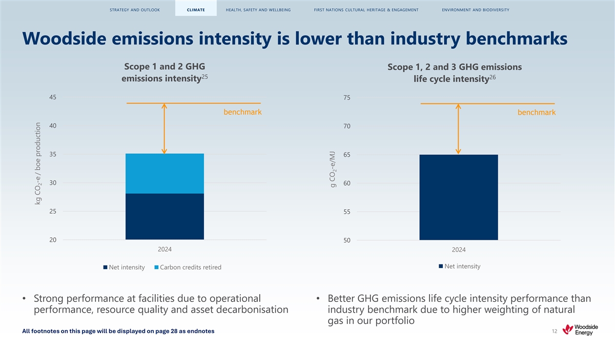 STRATEGY AND OUTLOOK C CL LIIM MA A TT EE HEALTH, SAFETY AND WELLBEING FIRST NATIONS CULTURAL HERITAGE & ENGAGEMENT ENVIRONMENT AND BIODIVERSITY Woodside emissions intensity is lower than industry benchmarks Scope 1 and 2 GHG Scope 1, 2 and 3 GHG emissions 25 26 emissions intensity life cycle intensity 45 75 benchmark benchmark 40 70 35 65 30 60 25 55 20 50 2024 2024 Net intensity Net intensity Carbon credits retired • Strong performance at facilities due to operational • Better GHG emissions life cycle intensity performance than performance, resource quality and asset decarbonisation industry benchmark due to higher weighting of natural gas in our portfolio All footnotes on this page will be displayed on page 28 as endnotes 12 kg CO -e / boe production 2 g CO -e/MJ 2