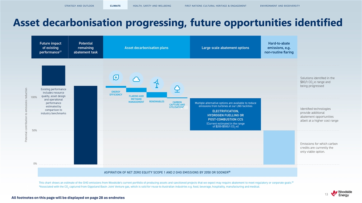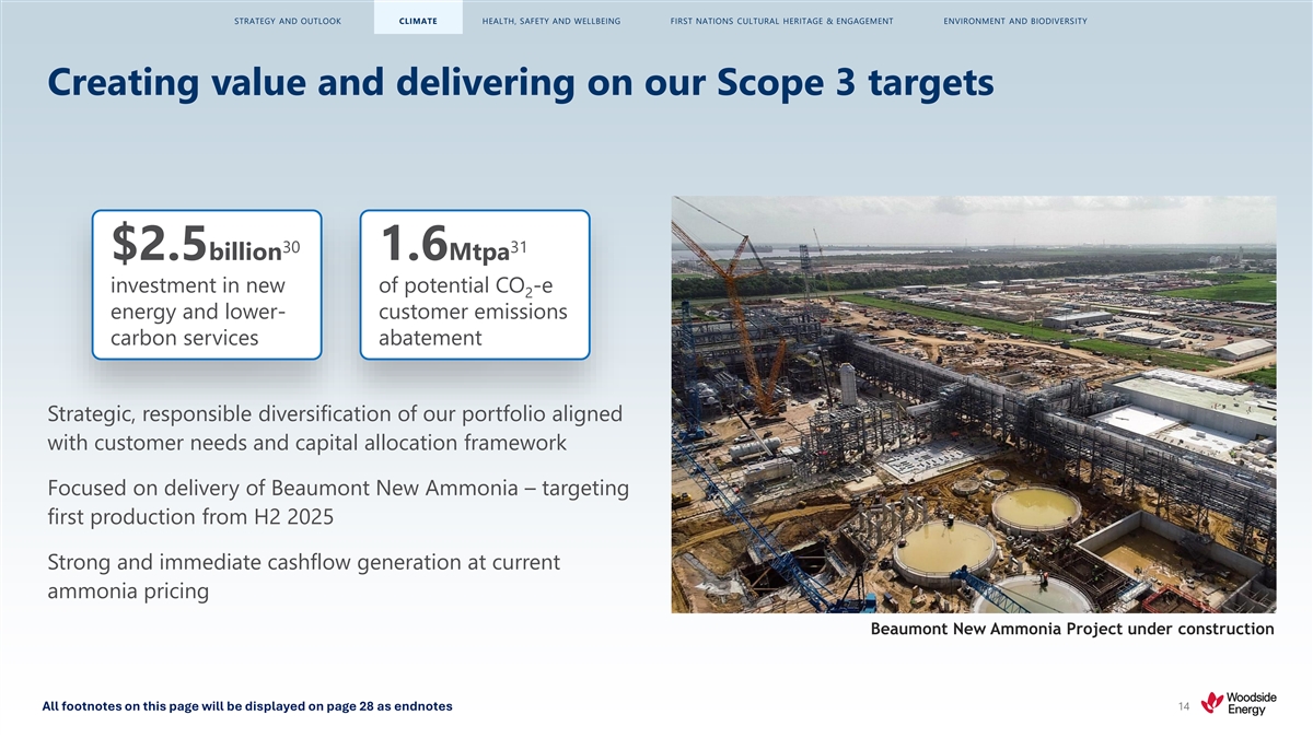 STRATEGY AND OUTLOOK C CL LIIM MA A TT EE HEALTH, SAFETY AND WELLBEING FIRST NATIONS CULTURAL HERITAGE & ENGAGEMENT ENVIRONMENT AND BIODIVERSITY Asset decarbonisation progressing, future opportunities identified 13 All footnotes on this page will be displayed on page 28 as endnotes