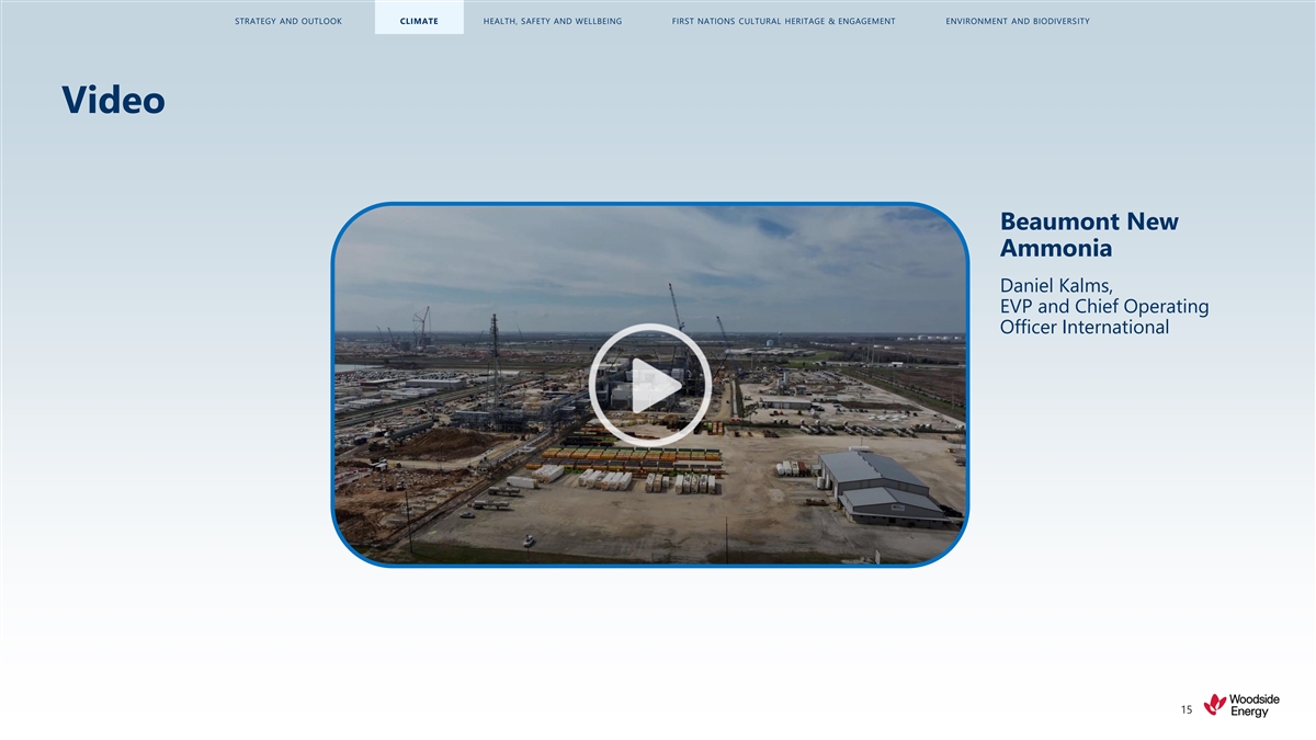 STRATEGY AND OUTLOOK C CL LIIM MA A TT EE HEALTH, SAFETY AND WELLBEING FIRST NATIONS CULTURAL HERITAGE & ENGAGEMENT ENVIRONMENT AND BIODIVERSITY Video Beaumont New Ammonia Daniel Kalms, EVP and Chief Operating Officer International 15