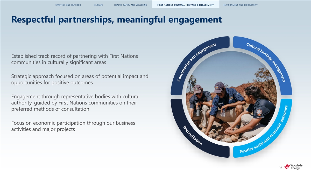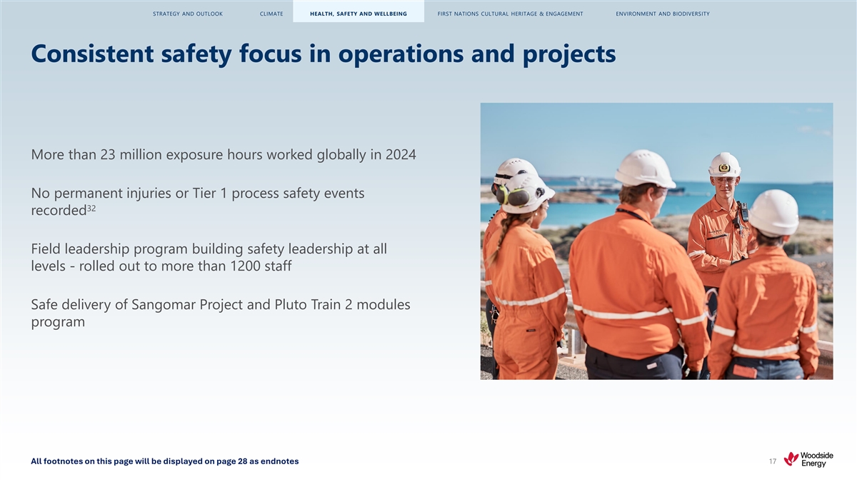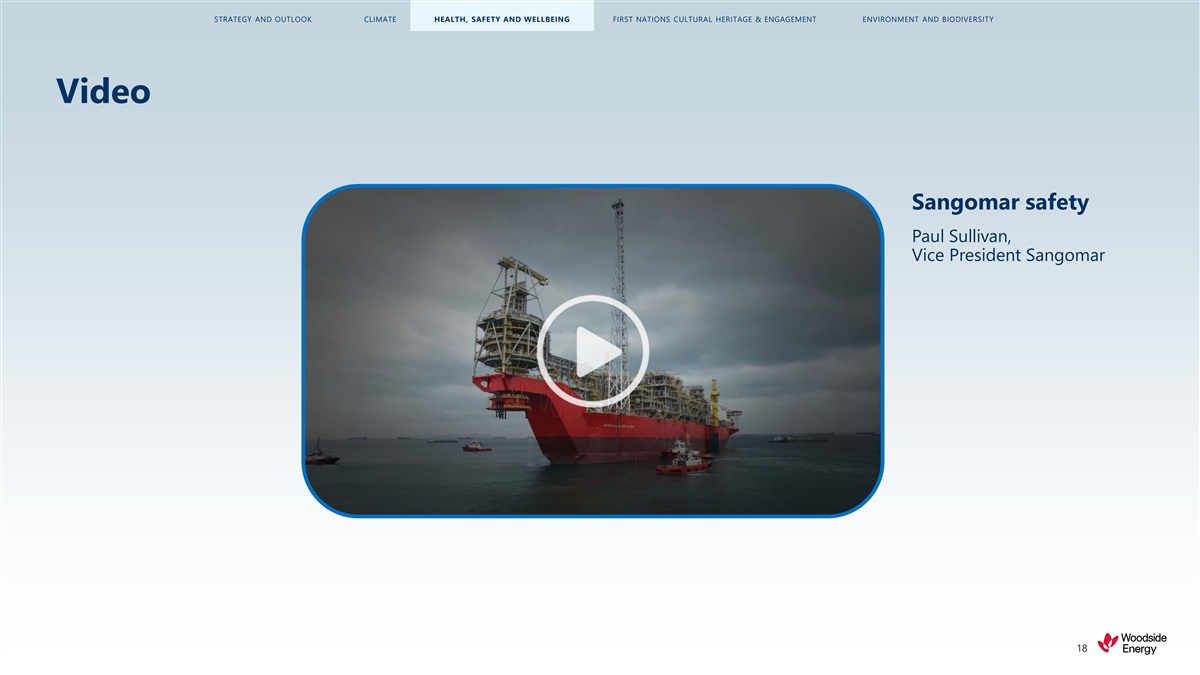 STRATEGY AND OUTLOOK CLIMATE HE HA EL AT LH TH , ,S S AA FF EETTY Y A AN ND D W WE EL LL LB BE EIIN NG G FIRST NATIONS CULTURAL HERITAGE & ENGAGEMENT ENVIRONMENT AND BIODIVERSITY Consistent safety focus in operations and projects More than 23 million exposure hours worked globally in 2024 No permanent injuries or Tier 1 process safety events 32 recorded Field leadership program building safety leadership at all levels - rolled out to more than 1200 staff Safe delivery of Sangomar Project and Pluto Train 2 modules program All footnotes on this page will be displayed on page 28 as endnotes 17