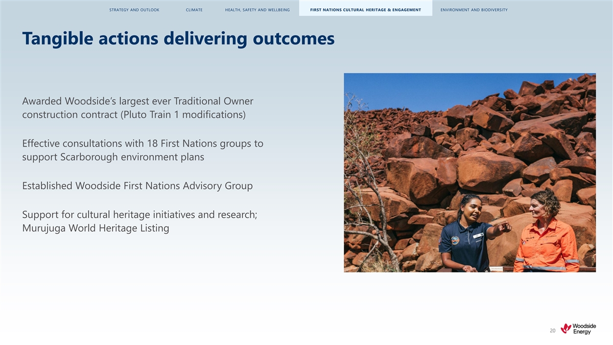 STRATEGY AND OUTLOOK CLIMATE HEALTH, SAFETY AND WELLBEING FIFR IR SS TT N N AA TT IIO ON NS S C CU UL LT TU UR RA AL L H HE ER RIITT A A G G EE & & E E NN GG AA GG EM EM EN ET NT ENVIRONMENT AND BIODIVERSITY Respectful partnerships, meaningful engagement Established track record of partnering with First Nations communities in culturally significant areas Strategic approach focused on areas of potential impact and opportunities for positive outcomes Engagement through representative bodies with cultural authority, guided by First Nations communities on their preferred methods of consultation Focus on economic participation through our business activities and major projects 19