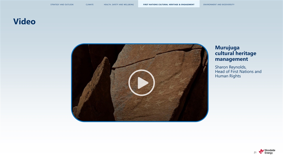 STRATEGY AND OUTLOOK CLIMATE HEALTH, SAFETY AND WELLBEING FIFR IR SS TT N N AA TT IIO ON NS S C CU UL LT TU UR RA AL L H HE ER RIITT A A G G EE & & E E NN GG AA GG EM EM EN ET NT ENVIRONMENT AND BIODIVERSITY Video Murujuga cultural heritage management Sharon Reynolds, Head of First Nations and Human Rights 21