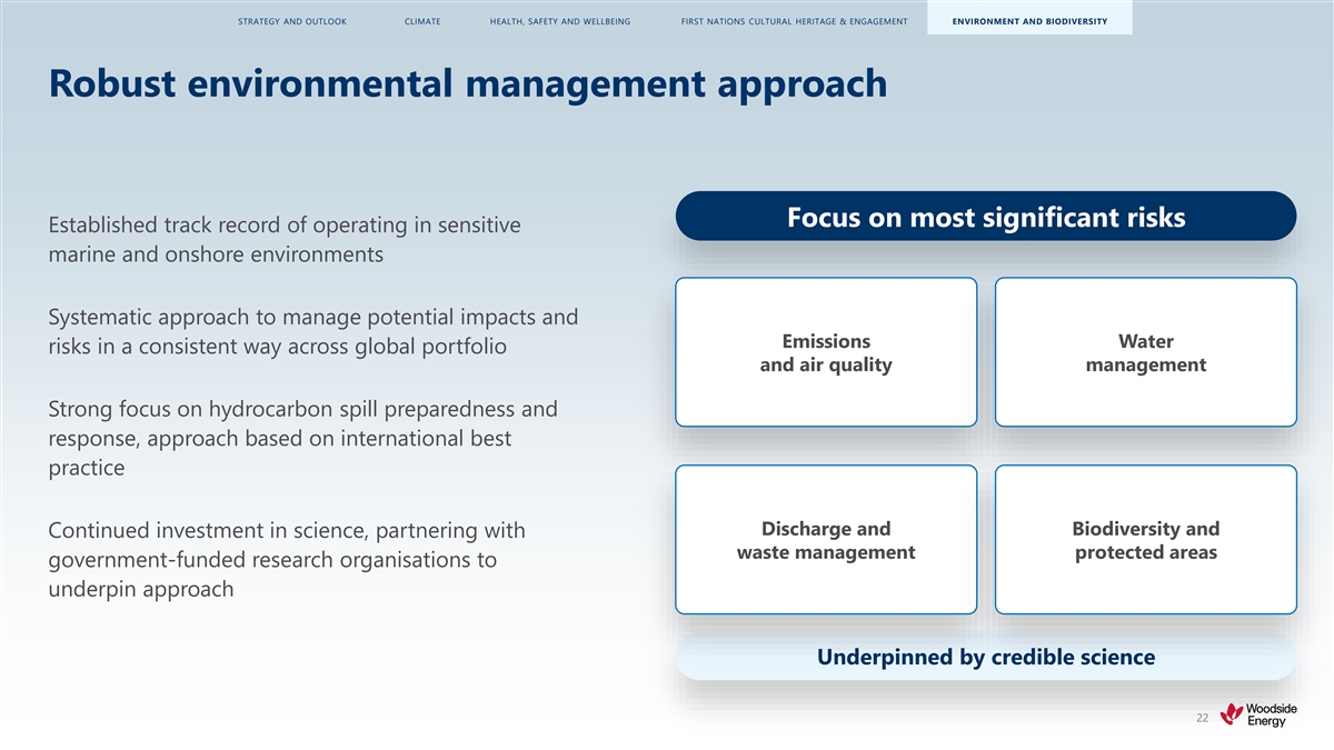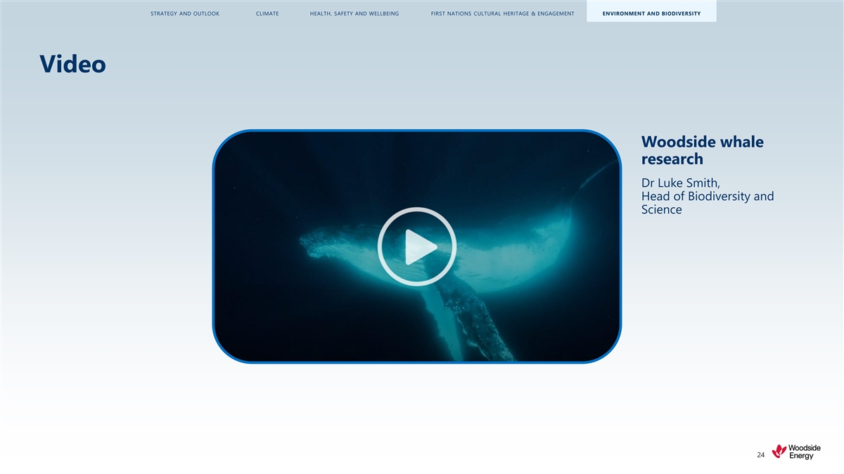 STRATEGY AND OUTLOOK CLIMATE HEALTH, SAFETY AND WELLBEING FIRST NATIONS CULTURAL HERITAGE & ENGAGEMENT EN EN VV IR IR OO N N M M EE N NT T A AN ND D B BIIO OD DI IV VE ER RS SIITTYY Video Woodside whale research Dr Luke Smith, Head of Biodiversity and Science 24