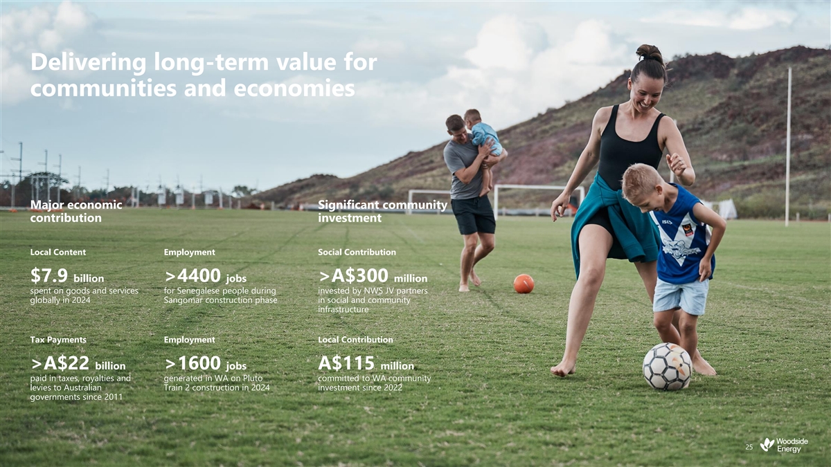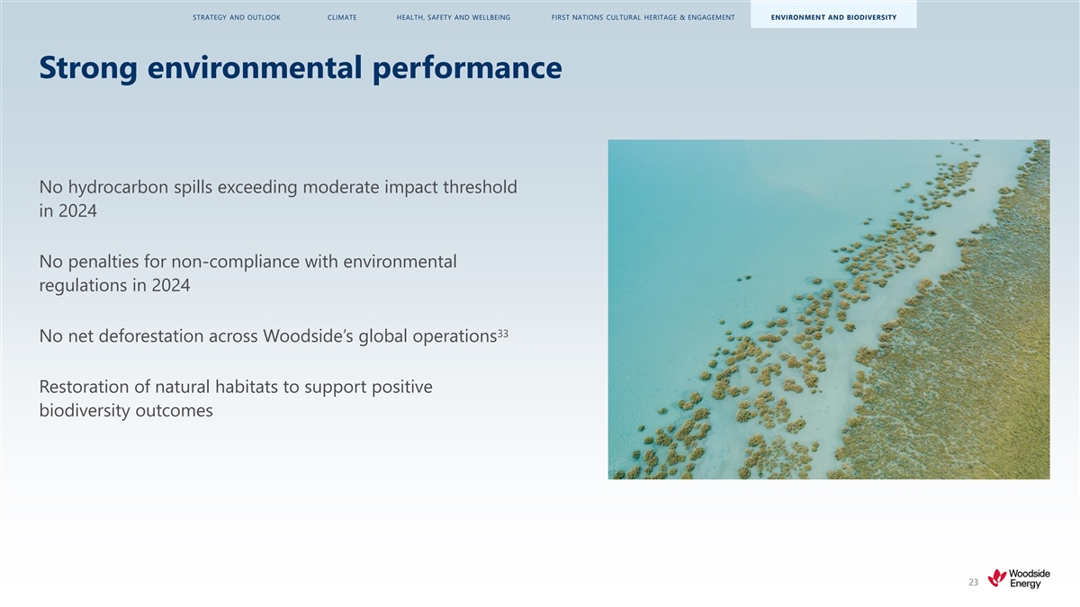 STRATEGY AND OUTLOOK CLIMATE HEALTH, SAFETY AND WELLBEING FIRST NATIONS CULTURAL HERITAGE & ENGAGEMENT EN EN VV IR IR OO N N M M EE N NT T A AN ND D B BIIO OD DI IV VE ER RS SIITTYY Strong environmental performance No hydrocarbon spills exceeding moderate impact threshold in 2024 No penalties for non-compliance with environmental regulations in 2024 33 No net deforestation across Woodside’s global operations Restoration of natural habitats to support positive biodiversity outcomes 23