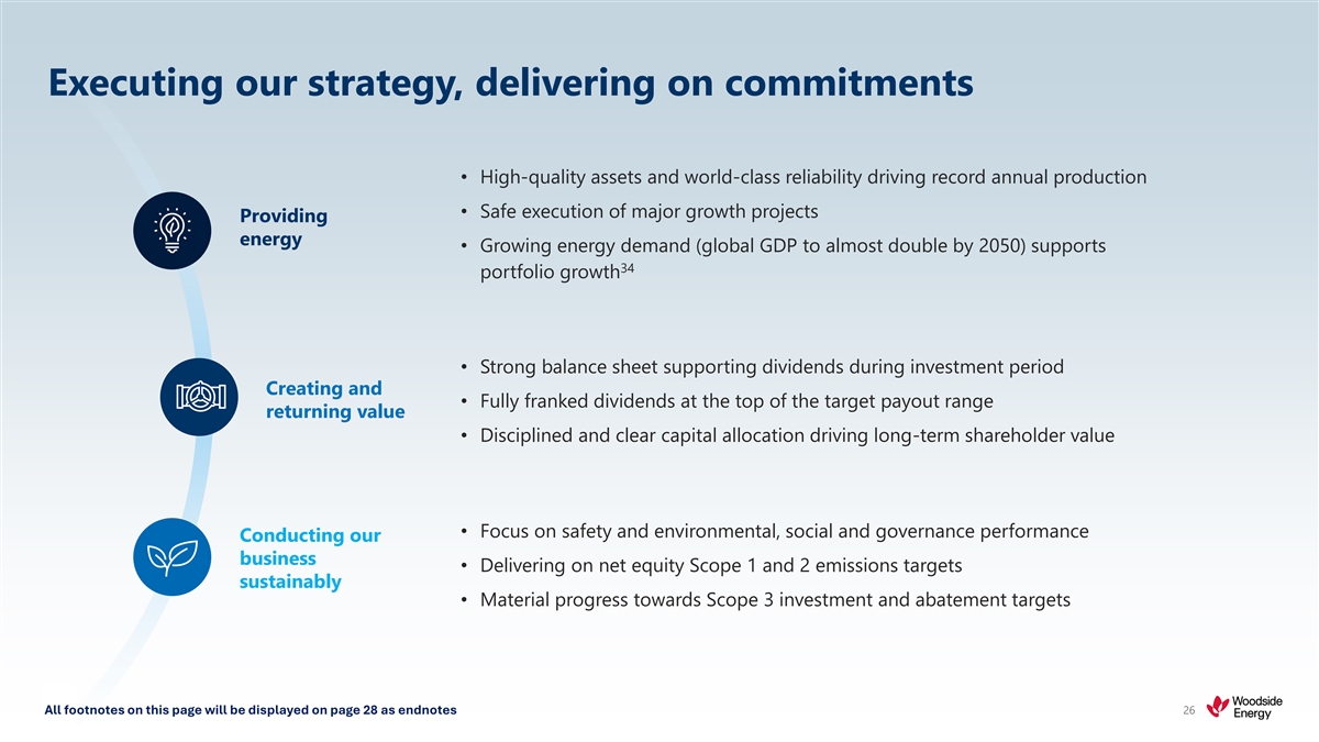 Executing our strategy, delivering on commitments • High-quality assets and world-class reliability driving record annual production • Safe execution of major growth projects Providing energy • Growing energy demand (global GDP to almost double by 2050) supports 34 portfolio growth • Strong balance sheet supporting dividends during investment period Creating and • Fully franked dividends at the top of the target payout range returning value • Disciplined and clear capital allocation driving long-term shareholder value • Focus on safety and environmental, social and governance performance Conducting our business • Delivering on net equity Scope 1 and 2 emissions targets sustainably • Material progress towards Scope 3 investment and abatement targets A 26 ll footnotes on this page will be displayed on page 28 as endnotes 26