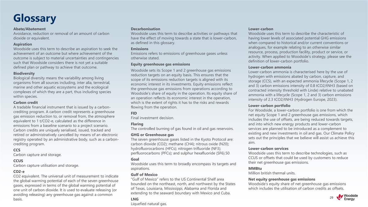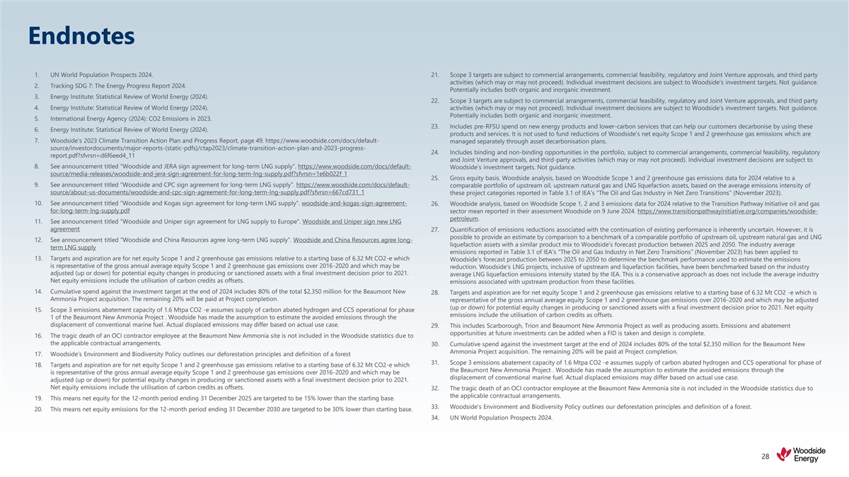 Endnotes 1. UN World Population Prospects 2024. 21. Scope 3 targets are subject to commercial arrangements, commercial feasibility, regulatory and Joint Venture approvals, and third party activities (which may or may not proceed). Individual investment decisions are subject to Woodside’s investment targets. Not guidance. 2. Tracking SDG 7: The Energy Progress Report 2024. Potentially includes both organic and inorganic investment. 3. Energy Institute: Statistical Review of World Energy (2024). 22. Scope 3 targets are subject to commercial arrangements, commercial feasibility, regulatory and Joint Venture approvals, and third party 4. Energy Institute: Statistical Review of World Energy (2024). activities (which may or may not proceed). Individual investment decisions are subject to Woodside’s investment targets. Not guidance. Potentially includes both organic and inorganic investment. 5. International Energy Agency (2024): CO2 Emissions in 2023. 23. Includes pre-RFSU spend on new energy products and lower-carbon services that can help our customers decarbonise by using these 6. Energy Institute: Statistical Review of World Energy (2024). products and services. It is not used to fund reductions of Woodside’s net equity Scope 1 and 2 greenhouse gas emissions which are 7. Woodside’s 2023 Climate Transition Action Plan and Progress Report, page 49. https://www.woodside.com/docs/default- managed separately through asset decarbonisation plans. source/investordocuments/major-reports-(static-pdfs)/ctap2023/climate-transition-action-plan-and-2023-progress- 24. Includes binding and non-binding opportunities in the portfolio, subject to commercial arrangements, commercial feasibility, regulatory report.pdf?sfvrsn=d6f6eed4_11 and Joint Venture approvals, and third-party activities (which may or may not proceed). Individual investment decisions are subject to 8. See announcement titled “Woodside and JERA sign agreement for long-term LNG supply”. https://www.woodside.com/docs/default- Woodside’s investment targets. Not guidance. source/media-releases/woodside-and-jera-sign-agreement-for-long-term-lng-supply.pdf?sfvrsn=1e6b022f_1 25. Gross equity basis. Woodside analysis, based on Woodside Scope 1 and 2 greenhouse gas emissions data for 2024 relative to a 9. See announcement titled “Woodside and CPC sign agreement for long-term LNG supply”. https://www.woodside.com/docs/default- comparable portfolio of upstream oil, upstream natural gas and LNG liquefaction assets, based on the average emissions intensity of source/about-us-documents/woodside-and-cpc-sign-agreement-for-long-term-lng-supply.pdf?sfvrsn=667cd731_1 these project categories reported in Table 3.1 of IEA’s “The Oil and Gas Industry in Net Zero Transitions” (November 2023). 10. See announcement titled “Woodside and Kogas sign agreement for long-term LNG supply”. woodside-and-kogas-sign-agreement- 26. Woodside analysis, based on Woodside Scope 1, 2 and 3 emissions data for 2024 relative to the Transition Pathway Initiative oil and gas for-long-term-lng-supply.pdf sector mean reported in their assessment Woodside on 9 June 2024. https://www.transitionpathwayinitiative.org/companies/woodside- petroleum. 11. See announcement titled “Woodside and Uniper sign agreement for LNG supply to Europe . Woodside and Uniper sign new LNG agreement 27. Quantification of emissions reductions associated with the continuation of existing performance is inherently uncertain. However, it is possible to provide an estimate by comparison to a benchmark of a comparable portfolio of upstream oil, upstream natural gas and LNG 12. See announcement titled “Woodside and China Resources agree long-term LNG supply”. Woodside and China Resources agree long- liquefaction assets with a similar product mix to Woodside’s forecast production between 2025 and 2050. The industry average term LNG supply emissions reported in Table 3.1 of IEA’s “The Oil and Gas Industry in Net Zero Transitions” (November 2023) has been applied to 13. Targets and aspiration are for net equity Scope 1 and 2 greenhouse gas emissions relative to a starting base of 6.32 Mt CO2-e which Woodside's forecast production between 2025 to 2050 to determine the benchmark performance used to estimate the emissions is representative of the gross annual average equity Scope 1 and 2 greenhouse gas emissions over 2016-2020 and which may be reduction. Woodside's LNG projects, inclusive of upstream and liquefaction facilities, have been benchmarked based on the industry adjusted (up or down) for potential equity changes in producing or sanctioned assets with a final investment decision prior to 2021. average LNG liquefaction emissions intensity stated by the IEA. This is a conservative approach as does not include the average industry Net equity emissions include the utilisation of carbon credits as offsets. emissions associated with upstream production from these facilities. 14. Cumulative spend against the investment target at the end of 2024 includes 80% of the total $2,350 million for the Beaumont New 28. Targets and aspiration are for net equity Scope 1 and 2 greenhouse gas emissions relative to a starting base of 6.32 Mt CO2 -e which is Ammonia Project acquisition. The remaining 20% will be paid at Project completion. representative of the gross annual average equity Scope 1 and 2 greenhouse gas emissions over 2016-2020 and which may be adjusted (up or down) for potential equity changes in producing or sanctioned assets with a final investment decision prior to 2021. Net equity 15. Scope 3 emissions abatement capacity of 1.6 Mtpa CO2 -e assumes supply of carbon abated hydrogen and CCS operational for phase emissions include the utilisation of carbon credits as offsets. 1 of the Beaumont New Ammonia Project . Woodside has made the assumption to estimate the avoided emissions through the displacement of conventional marine fuel. Actual displaced emissions may differ based on a