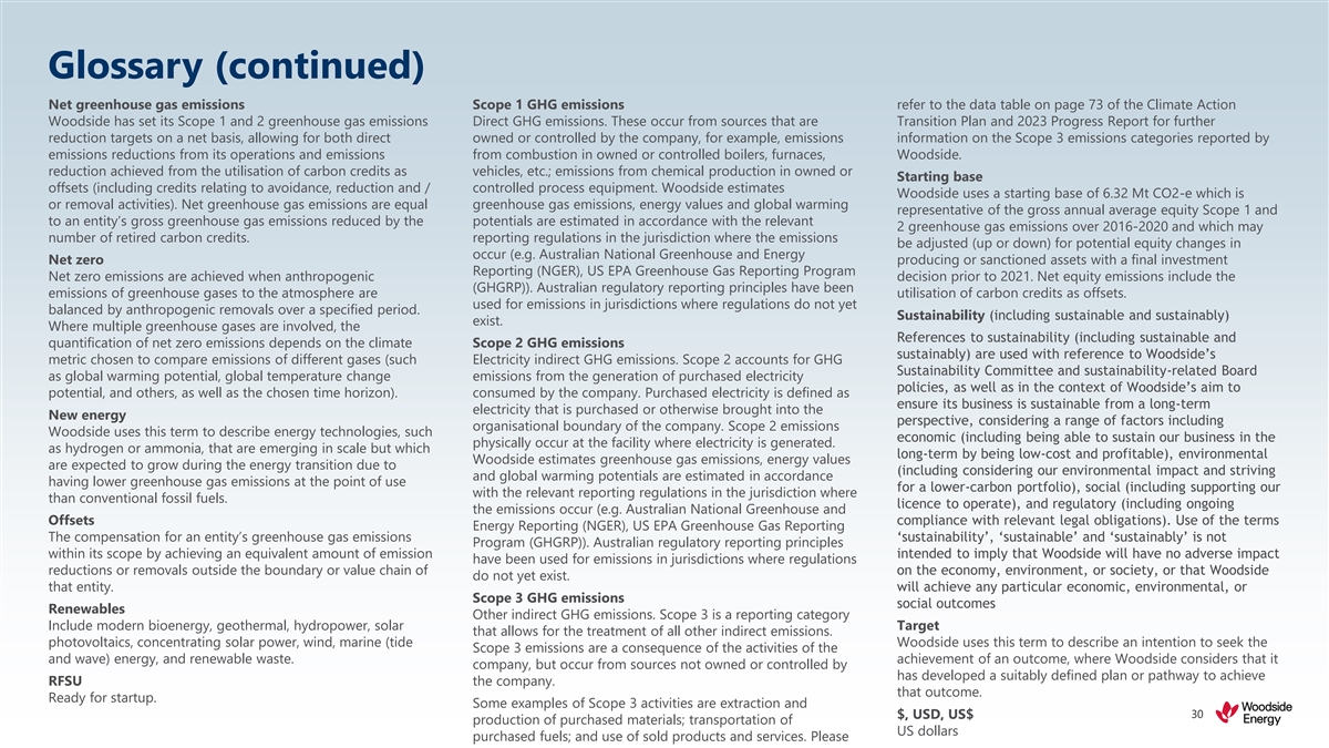 Glossary (continued) Net greenhouse gas emissions Scope 1 GHG emissions refer to the data table on page 73 of the Climate Action Woodside has set its Scope 1 and 2 greenhouse gas emissions Direct GHG emissions. These occur from sources that are Transition Plan and 2023 Progress Report for further reduction targets on a net basis, allowing for both direct owned or controlled by the company, for example, emissions information on the Scope 3 emissions categories reported by emissions reductions from its operations and emissions from combustion in owned or controlled boilers, furnaces, Woodside. reduction achieved from the utilisation of carbon credits as vehicles, etc.; emissions from chemical production in owned or Starting base offsets (including credits relating to avoidance, reduction and / controlled process equipment. Woodside estimates Woodside uses a starting base of 6.32 Mt CO2-e which is or removal activities). Net greenhouse gas emissions are equal greenhouse gas emissions, energy values and global warming representative of the gross annual average equity Scope 1 and to an entity’s gross greenhouse gas emissions reduced by the potentials are estimated in accordance with the relevant 2 greenhouse gas emissions over 2016-2020 and which may number of retired carbon credits. reporting regulations in the jurisdiction where the emissions be adjusted (up or down) for potential equity changes in occur (e.g. Australian National Greenhouse and Energy Net zero producing or sanctioned assets with a final investment Reporting (NGER), US EPA Greenhouse Gas Reporting Program Net zero emissions are achieved when anthropogenic decision prior to 2021. Net equity emissions include the (GHGRP)). Australian regulatory reporting principles have been emissions of greenhouse gases to the atmosphere are utilisation of carbon credits as offsets. used for emissions in jurisdictions where regulations do not yet balanced by anthropogenic removals over a specified period. Sustainability (including sustainable and sustainably) exist. Where multiple greenhouse gases are involved, the References to sustainability (including sustainable and quantification of net zero emissions depends on the climate Scope 2 GHG emissions sustainably) are used with reference to Woodside’s metric chosen to compare emissions of different gases (such Electricity indirect GHG emissions. Scope 2 accounts for GHG Sustainability Committee and sustainability-related Board as global warming potential, global temperature change emissions from the generation of purchased electricity policies, as well as in the context of Woodside’s aim to potential, and others, as well as the chosen time horizon). consumed by the company. Purchased electricity is defined as ensure its business is sustainable from a long-term electricity that is purchased or otherwise brought into the New energy perspective, considering a range of factors including organisational boundary of the company. Scope 2 emissions Woodside uses this term to describe energy technologies, such economic (including being able to sustain our business in the physically occur at the facility where electricity is generated. as hydrogen or ammonia, that are emerging in scale but which long-term by being low-cost and profitable), environmental Woodside estimates greenhouse gas emissions, energy values are expected to grow during the energy transition due to (including considering our environmental impact and striving and global warming potentials are estimated in accordance having lower greenhouse gas emissions at the point of use for a lower-carbon portfolio), social (including supporting our with the relevant reporting regulations in the jurisdiction where than conventional fossil fuels. licence to operate), and regulatory (including ongoing the emissions occur (e.g. Australian National Greenhouse and Offsets compliance with relevant legal obligations). Use of the terms Energy Reporting (NGER), US EPA Greenhouse Gas Reporting The compensation for an entity’s greenhouse gas emissions ‘sustainability’, ‘sustainable’ and ‘sustainably’ is not Program (GHGRP)). Australian regulatory reporting principles within its scope by achieving an equivalent amount of emission intended to imply that Woodside will have no adverse impact have been used for emissions in jurisdictions where regulations reductions or removals outside the boundary or value chain of on the economy, environment, or society, or that Woodside do not yet exist. that entity. will achieve any particular economic, environmental, or Scope 3 GHG emissions social outcomes Renewables Other indirect GHG emissions. Scope 3 is a reporting category Include modern bioenergy, geothermal, hydropower, solar Target that allows for the treatment of all other indirect emissions. photovoltaics, concentrating solar power, wind, marine (tide Woodside uses this term to describe an intention to seek the Scope 3 emissions are a consequence of the activities of the and wave) energy, and renewable waste. achievement of an outcome, where Woodside considers that it company, but occur from sources not owned or controlled by has developed a suitably defined plan or pathway to achieve RFSU the company. that outcome. Ready for startup. Some examples of Scope 3 activities are extraction and 30 $, USD, US$ production of purchased materials; transportation of US dollars purchased fuels; and use of sold products and services. Please