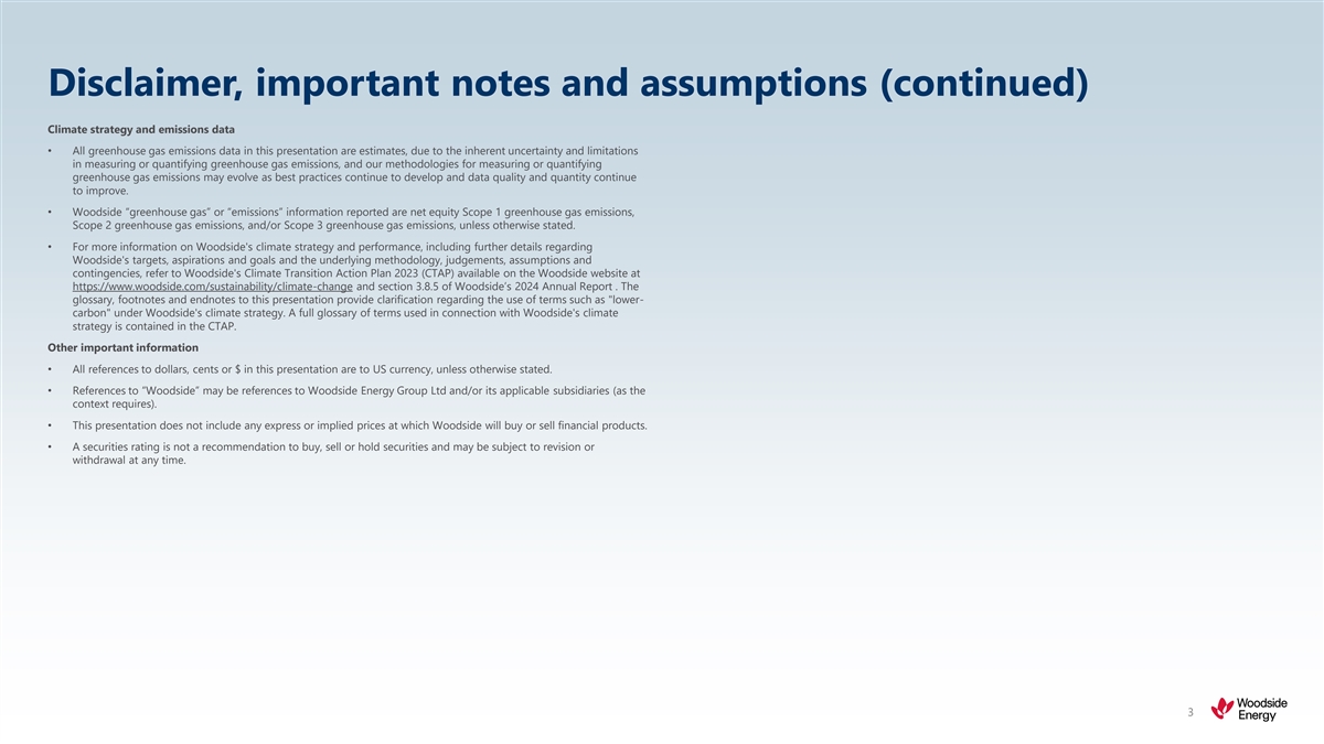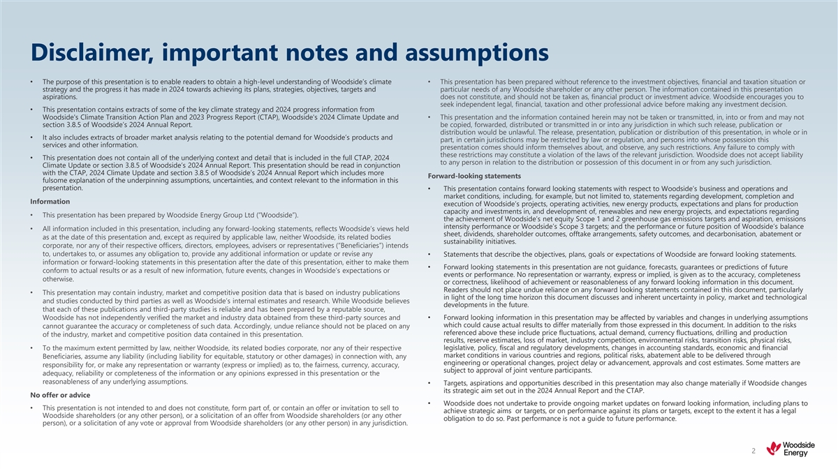 Disclaimer, important notes and assumptions • The purpose of this presentation is to enable readers to obtain a high-level understanding of Woodside’s climate • This presentation has been prepared without reference to the investment objectives, financial and taxation situation or strategy and the progress it has made in 2024 towards achieving its plans, strategies, objectives, targets and particular needs of any Woodside shareholder or any other person. The information contained in this presentation aspirations. does not constitute, and should not be taken as, financial product or investment advice. Woodside encourages you to seek independent legal, financial, taxation and other professional advice before making any investment decision. • This presentation contains extracts of some of the key climate strategy and 2024 progress information from Woodside's Climate Transition Action Plan and 2023 Progress Report (CTAP), Woodside's 2024 Climate Update and • This presentation and the information contained herein may not be taken or transmitted, in, into or from and may not section 3.8.5 of Woodside’s 2024 Annual Report. be copied, forwarded, distributed or transmitted in or into any jurisdiction in which such release, publication or distribution would be unlawful. The release, presentation, publication or distribution of this presentation, in whole or in • It also includes extracts of broader market analysis relating to the potential demand for Woodside’s products and part, in certain jurisdictions may be restricted by law or regulation, and persons into whose possession this services and other information. presentation comes should inform themselves about, and observe, any such restrictions. Any failure to comply with these restrictions may constitute a violation of the laws of the relevant jurisdiction. Woodside does not accept liability • This presentation does not contain all of the underlying context and detail that is included in the full CTAP, 2024 to any person in relation to the distribution or possession of this document in or from any such jurisdiction. Climate Update or section 3.8.5 of Woodside’s 2024 Annual Report. This presentation should be read in conjunction with the CTAP, 2024 Climate Update and section 3.8.5 of Woodside’s 2024 Annual Report which includes more Forward-looking statements fulsome explanation of the underpinning assumptions, uncertainties, and context relevant to the information in this presentation. • This presentation contains forward looking statements with respect to Woodside’s business and operations and market conditions, including, for example, but not limited to, statements regarding development, completion and Information execution of Woodside’s projects, operating activities, new energy products, expectations and plans for production capacity and investments in, and development of, renewables and new energy projects, and expectations regarding • This presentation has been prepared by Woodside Energy Group Ltd (“Woodside”). the achievement of Woodside’s net equity Scope 1 and 2 greenhouse gas emissions targets and aspiration, emissions intensity performance or Woodside’s Scope 3 targets; and the performance or future position of Woodside’s balance • All information included in this presentation, including any forward-looking statements, reflects Woodside’s views held sheet, dividends, shareholder outcomes, offtake arrangements, safety outcomes, and decarbonisation, abatement or as at the date of this presentation and, except as required by applicable law, neither Woodside, its related bodies sustainability initiatives. corporate, nor any of their respective officers, directors, employees, advisers or representatives (“Beneficiaries”) intends to, undertakes to, or assumes any obligation to, provide any additional information or update or revise any • Statements that describe the objectives, plans, goals or expectations of Woodside are forward looking statements. information or forward-looking statements in this presentation after the date of this presentation, either to make them • Forward looking statements in this presentation are not guidance, forecasts, guarantees or predictions of future conform to actual results or as a result of new information, future events, changes in Woodside’s expectations or events or performance. No representation or warranty, express or implied, is given as to the accuracy, completeness otherwise. or correctness, likelihood of achievement or reasonableness of any forward looking information in this document. Readers should not place undue reliance on any forward looking statements contained in this document, particularly • This presentation may contain industry, market and competitive position data that is based on industry publications in light of the long time horizon this document discusses and inherent uncertainty in policy, market and technological and studies conducted by third parties as well as Woodside’s internal estimates and research. While Woodside believes developments in the future. that each of these publications and third-party studies is reliable and has been prepared by a reputable source, Woodside has not independently verified the market and industry data obtained from these third-party sources and • Forward looking information in this presentation may be affected by variables and changes in underlying assumptions which could cause actual results to differ materially from those expressed in this document. In addition to the risks cannot guarantee the accuracy or completeness of such data. Accordingly, undue reliance should not be placed on any referenced above these include price fluctuations, actual demand, currency fluctuations, drilling and production of the industry, market and competitive position data contained in this presentation. results, reserve estimates, loss of market, industry competition, environmental risks, transition risks,