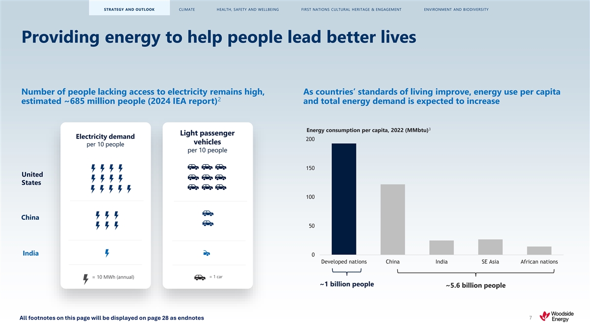 SSTTR RA AT TE EG GY Y A AN ND D O OU UT TLLO OO OK K CLIMATE HEALTH, SAFETY AND WELLBEING FIRST NATIONS CULTURAL HERITAGE & ENGAGEMENT ENVIRONMENT AND BIODIVERSITY Executing our strategy, delivering on commitments • High-quality assets and world-class reliability driving record annual production • Safe execution of major growth projects Providing energy • Growing energy demand (global GDP to almost double by 2050) supports 1 portfolio growth • Strong balance sheet supporting dividends during investment period Creating and • Fully franked dividends at the top of the target payout range returning value • Disciplined and clear capital allocation driving long-term shareholder value • Focus on safety and environmental, social and governance performance Conducting our business • Delivering on net equity Scope 1 and 2 emissions targets sustainably • Material progress towards Scope 3 investment and abatement targets All footnotes on this page will be displayed on page 28 as endnotes 6