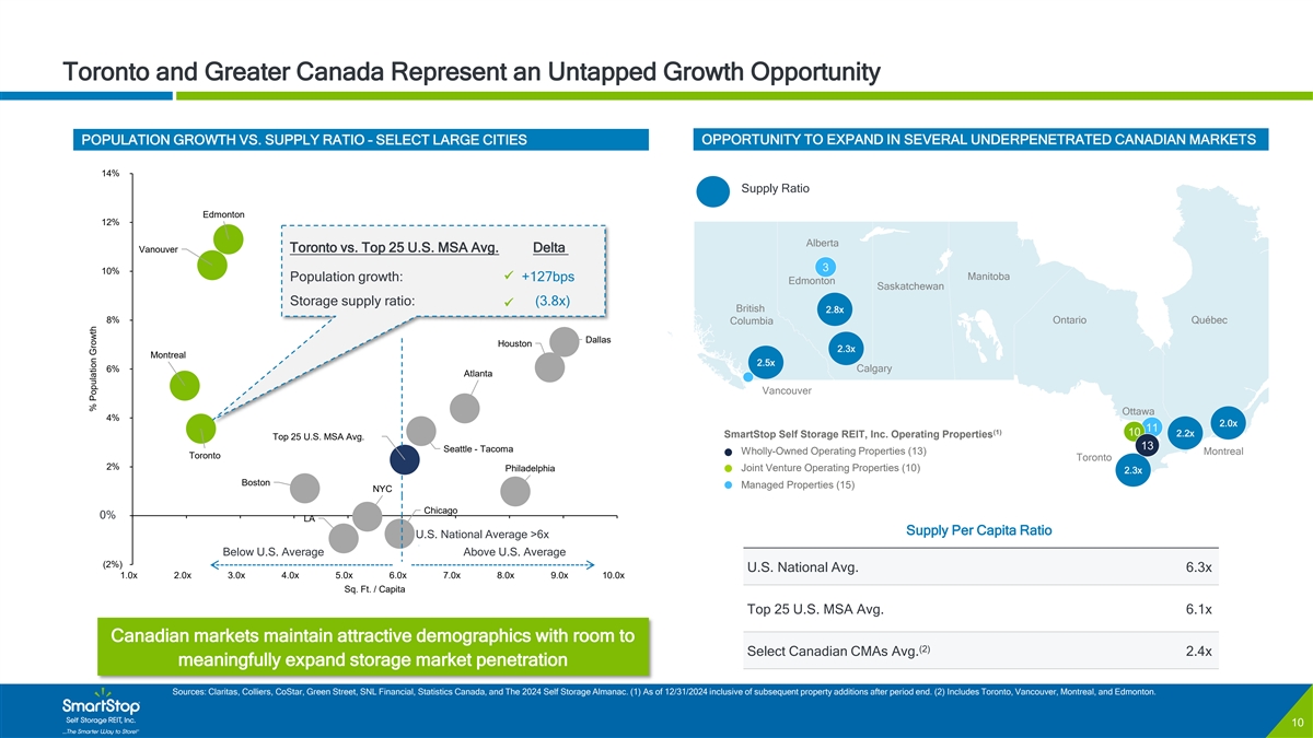 C O N F I D E N T I A L Toronto and Greater Canada Represent an Untapped Growth Opportunity POPULATION GROWTH VS. SUPPLY RATIO – SELECT LARGE CITIES OPPORTUNITY TO EXPAND IN SEVERAL UNDERPENETRATED CANADIAN MARKETS 14% Supply Ratio Edmonton 12% Alberta Toronto vs. Top 25 U.S. MSA Avg. Delta Vanouver 3 10% ✓ Manitoba Population growth: vs. U. +127bps Edmonton Saskatchewan Storage supply ratio: (3.8x) ✓ British 2.8x 8% Ontario Québec Columbia Dallas Houston 2.3x Montreal 2.5x 6% Calgary Atlanta Vancouver Ottawa 4% 2.0x 11 (1) 10 2.2x SmartStop Self Storage REIT, Inc. Operating Properties Top 25 U.S. MSA Avg. 13 Seattle - Tacoma Wholly-Owned Operating Properties (13) Montreal Toronto Toronto 2% Philadelphia Joint Venture Operating Properties (10) 2.3x Boston Managed Properties (15) NYC Chicago 0% -- LA Supply Per Capita Ratio U.S. National Average >6x Below U.S. Average Above U.S. Average (2%) U.S. National Avg. 6.3x 1.0x 2.0x 3.0x 4.0x 5.0x 6.0x 7.0x 8.0x 9.0x 10.0x Sq. Ft. / Capita Top 25 U.S. MSA Avg. 6.1x Canadian markets maintain attractive demographics with room to (2) Select Canadian CMAs Avg. 2.4x meaningfully expand storage market penetration Sources: Claritas, Colliers, CoStar, Green Street, SNL Financial, Statistics Canada, and The 2024 Self Storage Almanac. (1) As of 12/31/2024 inclusive of subsequent property additions after period end. (2) Includes Toronto, Vancouver, Montreal, and Edmonton. 10 % Population Growth