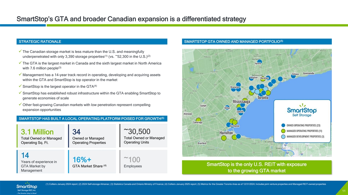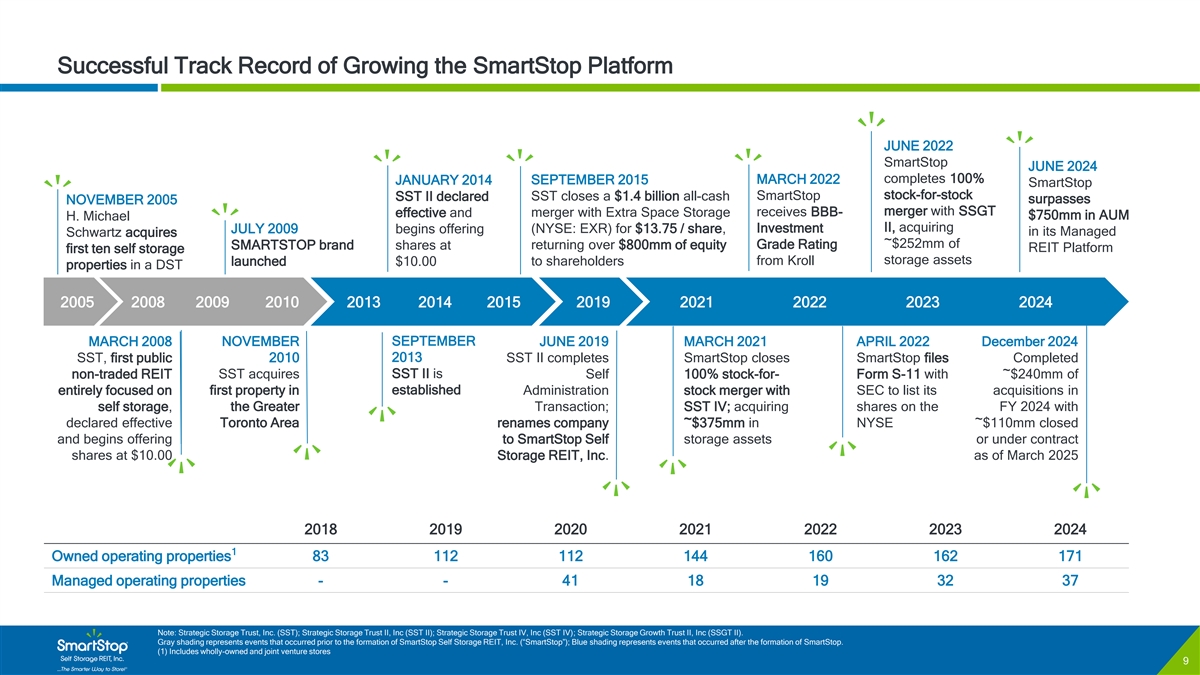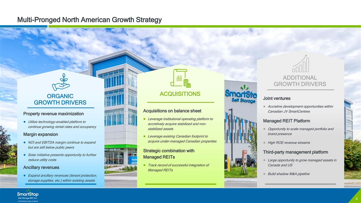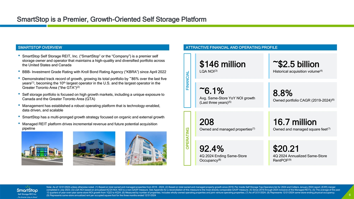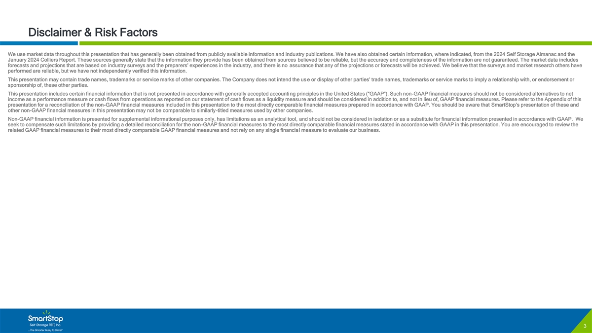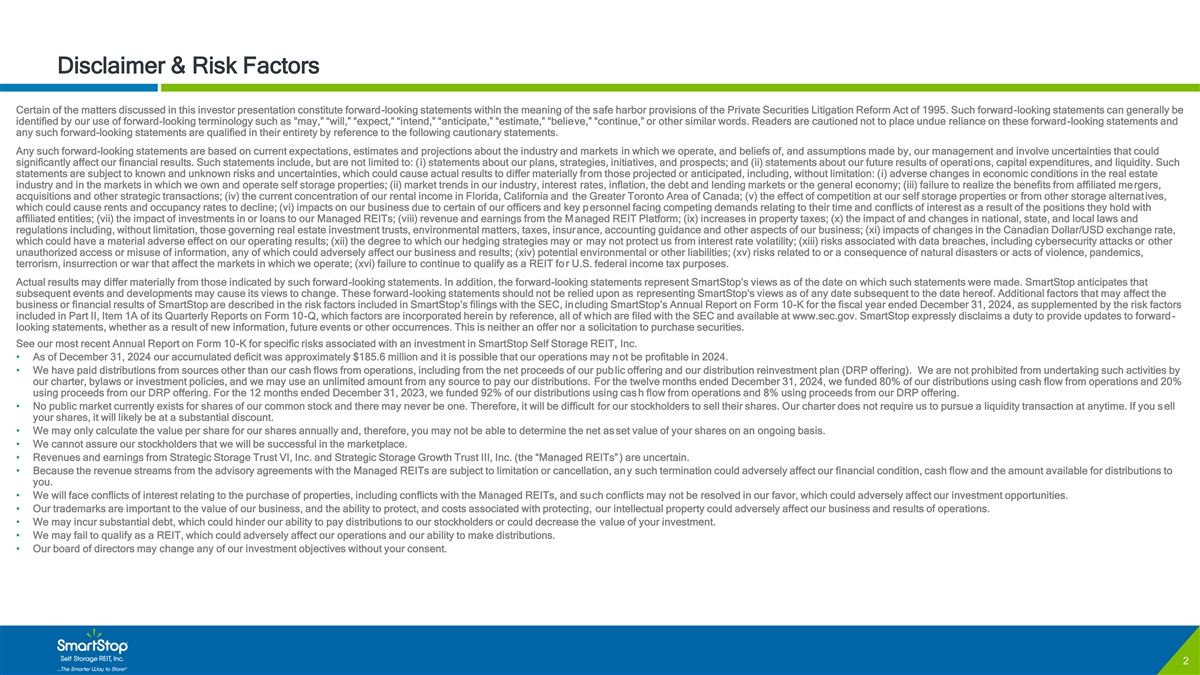 C O N F I D E N T I A L Disclaimer & Risk Factors Certain of the matters discussed in this investor presentation constitute forward-looking statements within the meaning of the safe harbor provisions of the Private Securities Litigation Reform Act of 1995. Such forward-looking statements can generally be identified by our use of forward-looking terminology such as “may,” “will,” “expect,” “intend,” “anticipate,” “estimate,” “believe,” “continue,” or other similar words. Readers are cautioned not to place undue reliance on these forward-looking statements and any such forward-looking statements are qualified in their entirety by reference to the following cautionary statements. Any such forward-looking statements are based on current expectations, estimates and projections about the industry and markets in which we operate, and beliefs of, and assumptions made by, our management and involve uncertainties that could significantly affect our financial results. Such statements include, but are not limited to: (i) statements about our plans, strategies, initiatives, and prospects; and (ii) statements about our future results of operations, capital expenditures, and liquidity. Such statements are subject to known and unknown risks and uncertainties, which could cause actual results to differ materially from those projected or anticipated, including, without limitation: (i) adverse changes in economic conditions in the real estate industry and in the markets in which we own and operate self storage properties; (ii) market trends in our industry, interest rates, inflation, the debt and lending markets or the general economy; (iii) failure to realize the benefits from affiliated mergers, acquisitions and other strategic transactions; (iv) the current concentration of our rental income in Florida, California and the Greater Toronto Area of Canada; (v) the effect of competition at our self storage properties or from other storage alternatives, which could cause rents and occupancy rates to decline; (vi) impacts on our business due to certain of our officers and key personnel facing competing demands relating to their time and conflicts of interest as a result of the positions they hold with affiliated entities; (vii) the impact of investments in or loans to our Managed REITs; (viii) revenue and earnings from the Managed REIT Platform; (ix) increases in property taxes; (x) the impact of and changes in national, state, and local laws and regulations including, without limitation, those governing real estate investment trusts, environmental matters, taxes, insurance, accounting guidance and other aspects of our business; (xi) impacts of changes in the Canadian Dollar/USD exchange rate, which could have a material adverse effect on our operating results; (xii) the degree to which our hedging strategies may or may not protect us from interest rate volatility; (xiii) risks associated with data breaches, including cybersecurity attacks or other unauthorized access or misuse of information, any of which could adversely affect our business and results; (xiv) potential environmental or other liabilities; (xv) risks related to or a consequence of natural disasters or acts of violence, pandemics, terrorism, insurrection or war that affect the markets in which we operate; (xvi) failure to continue to qualify as a REIT for U.S. federal income tax purposes. Actual results may differ materially from those indicated by such forward-looking statements. In addition, the forward-looking statements represent SmartStop’s views as of the date on which such statements were made. SmartStop anticipates that subsequent events and developments may cause its views to change. These forward-looking statements should not be relied upon as representing SmartStop’s views as of any date subsequent to the date hereof. Additional factors that may affect the business or financial results of SmartStop are described in the risk factors included in SmartStop’s filings with the SEC, including SmartStop’s Annual Report on Form 10-K for the fiscal year ended December 31, 2024, as supplemented by the risk factors included in Part II, Item 1A of its Quarterly Reports on Form 10-Q, which factors are incorporated herein by reference, all of which are filed with the SEC and available at www.sec.gov. SmartStop expressly disclaims a duty to provide updates to forward- looking statements, whether as a result of new information, future events or other occurrences. This is neither an offer nor a solicitation to purchase securities. See our most recent Annual Report on Form 10-K for specific risks associated with an investment in SmartStop Self Storage REIT, Inc. • As of December 31, 2024 our accumulated deficit was approximately $185.6 million and it is possible that our operations may not be profitable in 2024. • We have paid distributions from sources other than our cash flows from operations, including from the net proceeds of our public offering and our distribution reinvestment plan (DRP offering). We are not prohibited from undertaking such activities by our charter, bylaws or investment policies, and we may use an unlimited amount from any source to pay our distributions. For the twelve months ended December 31, 2024, we funded 80% of our distributions using cash flow from operations and 20% using proceeds from our DRP offering. For the 12 months ended December 31, 2023, we funded 92% of our distributions using cas h flow from operations and 8% using proceeds from our DRP offering. • No public market currently exists for shares of our common stock and there may never be one. Therefore, it will be difficult for our stockholders to sell their shares. Our charter does not require us to pursue a liquidity transaction at anytime. If you sell your shares, it will likely be at a substantial discount. • We may only calculate the value per share for our shares annually and, therefore, you may not be able t