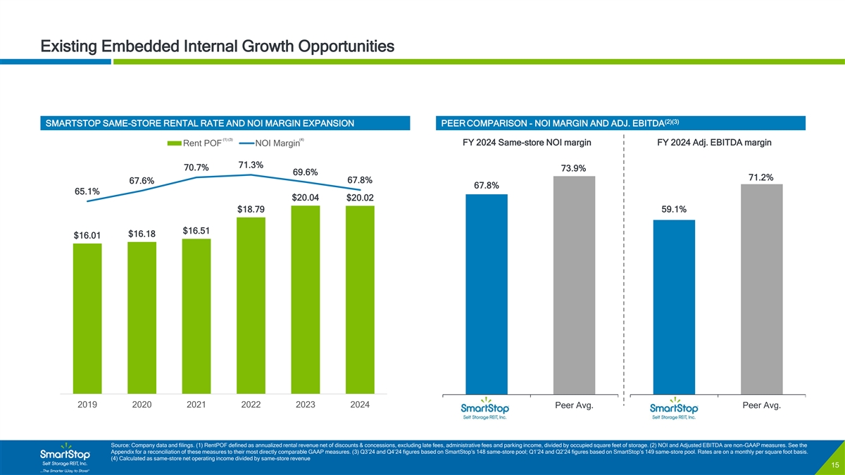 C O N F I D E N T I A L Internal Growth Strategy (1) INTERNAL GROWTH STRATEGIC HIGHLIGHTS HISTORICAL SAME-STORE AVERAGE OCCUPANCY 95.5% 95.4% 95.1% Average: 93.5% 94.5% 93.7% 93.3% 93.1% 92.4% 93.2% 92.5% 92.5% 92.4% 92.4% Maximize net operating income with a balanced ✓ approach to rate and occupancy Majority of the Company’s same-store portfolio base has been owned or managed less than five years and 4Q21 1Q22 2Q22 3Q22 4Q22 1Q23 2Q23 3Q23 4Q23 1Q24 2Q24 3Q24 4Q24 ✓ retains additional rate upside (1) (2) HISTORICAL SAME-STORE RENTPOF $20.25 $20.37 $20.21 $20.15 $19.99 $19.84 $19.64 $19.94 Average: $19.47 $19.49 $19.30 $18.47 $17.68 $17.77 SmartStop’s customer service platform drives ✓ consumer traffic and develops a sticky customer base Asset management technology and experienced 4Q21 1Q22 2Q22 3Q22 4Q22 1Q23 2Q23 3Q23 4Q23 1Q24 2Q24 3Q24 4Q24 personnel all help drive expense savings and ✓ ultimately bottom-line growth SmartStop’s strategic internal growth initiatives have proven successful on key operational statistics (1) Q3 and Q4’24 figures based on SmartStop’s 148 same-store pool; Q1’24 and Q2’24 figures based on SmartStop’s 149 same-store pool. All 2023 figures based on SmartStop’s 137 property same-store pool. All 2022 figures based on SmartStop’s 109 property same-store pool. All 2021 figures based on SmartStop’s 103 property same-store pool. (2) RentPOF defined as annualized rental revenue net of discounts & concessions, excluding late fees, administrative fees and parking income, divided by occupied square feet of storage. 14