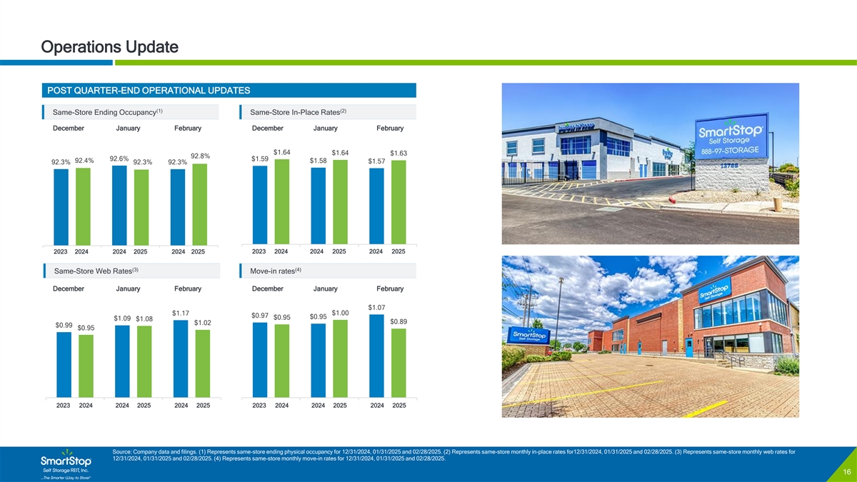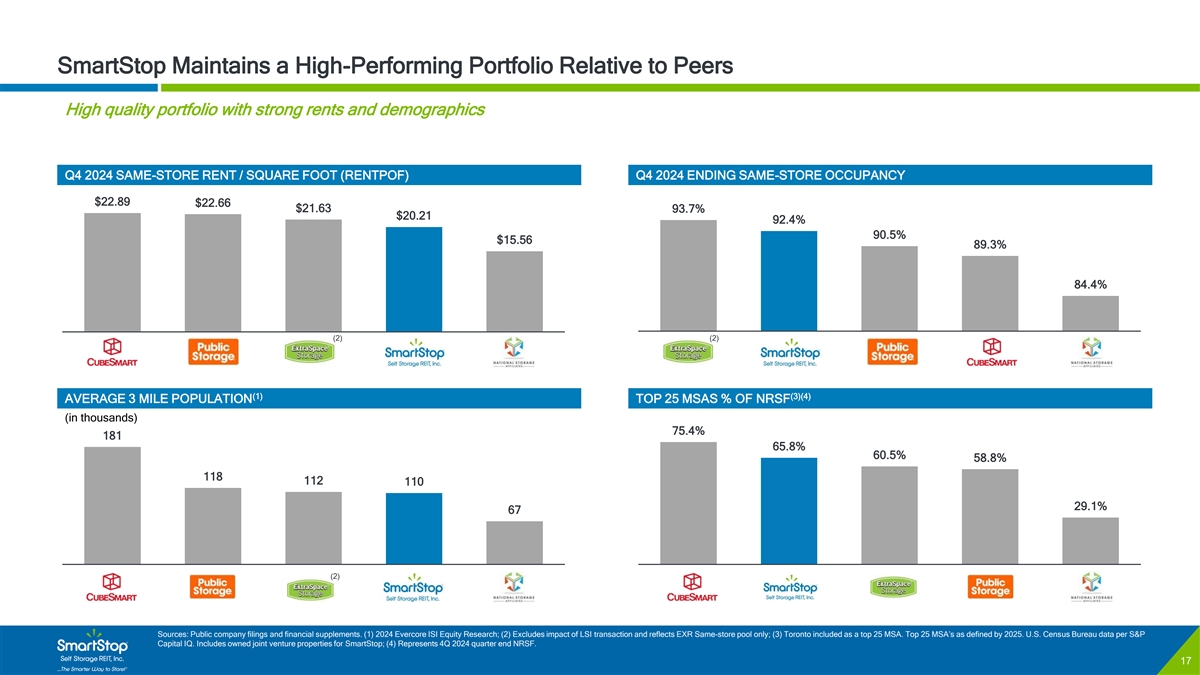 C O N F I D E N T I A L Operations Update POST QUARTER-END OPERATIONAL UPDATES (1) (2) Same-Store Ending Occupancy Same-Store In-Place Rates December January February December January February $1.64 $1.64 $1.63 92.8% 92.6% $1.59 92.4% $1.58 $1.57 92.3% 92.3% 92.3% Surprise, AZ 2023 2024 2024 2025 2024 2025 2023 2024 2024 2025 2024 2025 (3) (4) Same-Store Web Rates Move-in rates December January February December January February $1.07 $1.17 $1.00 $0.97 $0.95 $0.95 $1.09 $1.08 $0.89 $1.02 $0.99 $0.95 2023 2024 2024 2025 2024 2025 2023 2024 2024 2025 2024 2025 Algonquin, IL Source: Company data and filings. (1) Represents same-store ending physical occupancy for 12/31/2024, 01/31/2025 and 02/28/2025. (2) Represents same-store monthly in-place rates for12/31/2024, 01/31/2025 and 02/28/2025. (3) Represents same-store monthly web rates for 12/31/2024, 01/31/2025 and 02/28/2025. (4) Represents same-store monthly move-in rates for 12/31/2024, 01/31/2025 and 02/28/2025. 16