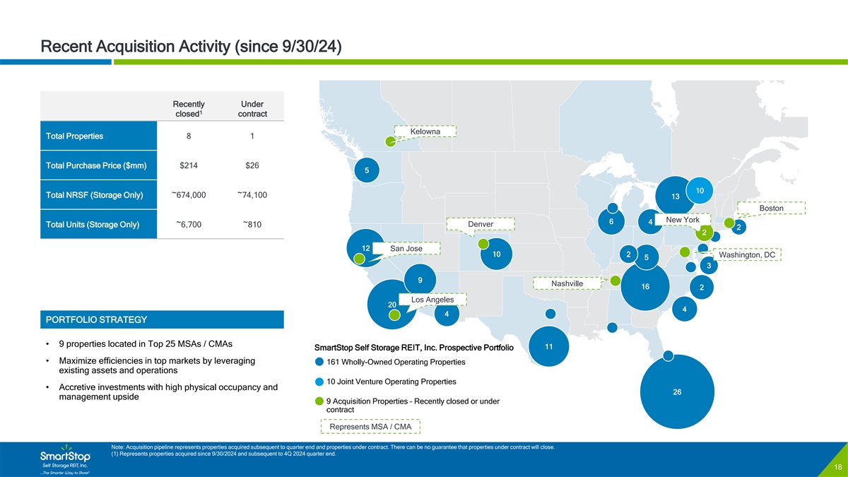 C O N F I D E N T I A L SmartStop Maintains a High-Performing Portfolio Relative to Peers High quality portfolio with strong rents and demographics Q4 2024 SAME-STORE RENT / SQUARE FOOT (RENTPOF) Q4 2024 ENDING SAME-STORE OCCUPANCY $22.89 $22.66 $21.63 93.7% $20.21 92.4% 90.5% $15.56 89.3% 84.4% (2) (2) (1) (3)(4) AVERAGE 3 MILE POPULATION TOP 25 MSAS % OF NRSF (in thousands) 75.4% 181 65.8% 60.5% 58.8% 118 112 110 29.1% 67 (2) Sources: Public company filings and financial supplements. (1) 2024 Evercore ISI Equity Research; (2) Excludes impact of LSI transaction and reflects EXR Same-store pool only; (3) Toronto included as a top 25 MSA. Top 25 MSA’s as defined by 2025. U.S. Census Bureau data per S&P Capital IQ. Includes owned joint venture properties for SmartStop; (4) Represents 4Q 2024 quarter end NRSF. 17