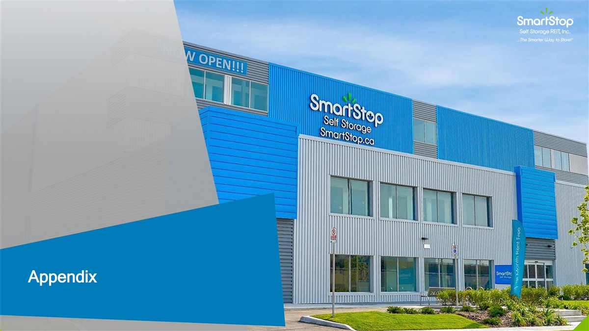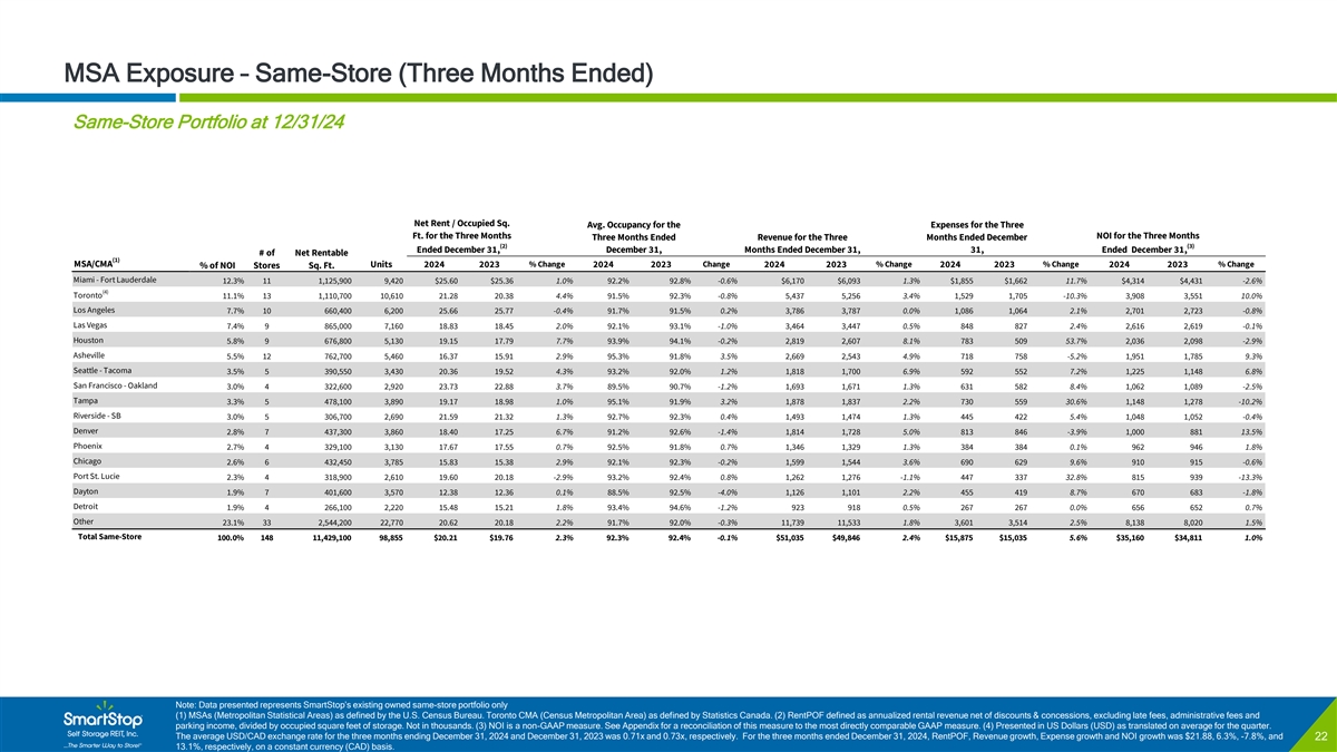 C O N F I D E N T I A L MSA Exposure – Same-Store (Three Months Ended) Same-Store Portfolio at 12/31/24 Net Rent / Occupied Sq. Avg. Occupancy for the Expenses for the Three Ft. for the Three Months NOI for the Three Months Three Months Ended Revenue for the Three Months Ended December (2) (3) Ended December 31, December 31, Months Ended December 31, 31, Ended December 31, # of Net Rentable (1) MSA/CMA Units 2024 2023 % Change 2024 2023 Change 2024 2023 % Change 2024 2023 % Change 2024 2023 % Change % of NOI Stores Sq. Ft. Miami - Fort Lauderdale 12.3% 11 1,125,900 9,420 $25.60 $25.36 1.0% 92.2% 92.8% -0.6% $6,170 $6,093 1.3% $1,855 $1,662 11.7% $4,314 $4,431 -2.6% (4) Toronto 11.1% 13 1,110,700 10,610 21.28 20.38 4.4% 91.5% 92.3% -0.8% 5,437 5,256 3.4% 1,529 1,705 -10.3% 3,908 3,551 10.0% Los Angeles 7.7% 10 660,400 6,200 25.66 25.77 -0.4% 91.7% 91.5% 0.2% 3,786 3,787 0.0% 1,086 1,064 2.1% 2,701 2,723 -0.8% Las Vegas 7.4% 9 865,000 7,160 18.83 18.45 2.0% 92.1% 93.1% -1.0% 3,464 3,447 0.5% 848 827 2.4% 2,616 2,619 -0.1% Houston 5.8% 9 676,800 5,130 19.15 17.79 7.7% 93.9% 94.1% -0.2% 2,819 2,607 8.1% 783 509 53.7% 2,036 2,098 -2.9% Asheville 5.5% 12 762,700 5,460 16.37 15.91 2.9% 95.3% 91.8% 3.5% 2,669 2,543 4.9% 718 758 -5.2% 1,951 1,785 9.3% Seattle - Tacoma 3.5% 5 390,550 3,430 20.36 19.52 4.3% 93.2% 92.0% 1.2% 1,818 1,700 6.9% 592 552 7.2% 1,225 1,148 6.8% San Francisco - Oakland 3.0% 4 322,600 2,920 23.73 22.88 3.7% 89.5% 90.7% -1.2% 1,693 1,671 1.3% 631 582 8.4% 1,062 1,089 -2.5% Tampa 3.3% 5 478,100 3,890 19.17 18.98 1.0% 95.1% 91.9% 3.2% 1,878 1,837 2.2% 730 559 30.6% 1,148 1,278 -10.2% Riverside - SB 3.0% 5 306,700 2,690 21.59 21.32 1.3% 92.7% 92.3% 0.4% 1,493 1,474 1.3% 445 422 5.4% 1,048 1,052 -0.4% Denver 2.8% 7 437,300 3,860 18.40 17.25 6.7% 91.2% 92.6% -1.4% 1,814 1,728 5.0% 813 846 -3.9% 1,000 881 13.5% Phoenix 2.7% 4 329,100 3,130 17.67 17.55 0.7% 92.5% 91.8% 0.7% 1,346 1,329 1.3% 384 384 0.1% 962 946 1.8% Chicago 2.6% 6 432,450 3,785 15.83 15.38 2.9% 92.1% 92.3% -0.2% 1,599 1,544 3.6% 690 629 9.6% 910 915 -0.6% Port St. Lucie 2.3% 4 318,900 2,610 19.60 20.18 -2.9% 93.2% 92.4% 0.8% 1,262 1,276 -1.1% 447 337 32.8% 815 939 -13.3% Dayton 1.9% 7 401,600 3,570 12.38 12.36 0.1% 88.5% 92.5% -4.0% 1,126 1,101 2.2% 455 419 8.7% 670 683 -1.8% Detroit 1.9% 4 266,100 2,220 15.48 15.21 1.8% 93.4% 94.6% -1.2% 923 918 0.5% 267 267 0.0% 656 652 0.7% Other 23.1% 33 2,544,200 22,770 20.62 20.18 2.2% 91.7% 92.0% -0.3% 11,739 11,533 1.8% 3,601 3,514 2.5% 8,138 8,020 1.5% Total Same-Store 100.0% 148 1 1,429,100 98,855 $20.21 $19.76 2.3% 92.3% 92.4% -0.1% $51,035 $49,846 2.4% $15,875 $15,035 5.6% $35,160 $34,811 1.0% Note: Data presented represents SmartStop’s existing owned same-store portfolio only (1) MSAs (Metropolitan Statistical Areas) as defined by the U.S. Census Bureau. Toronto CMA (Census Metropolitan Area) as defined by Statistics Canada. (2) RentPOF defined as annualized rental revenue net of discounts & concessions, excluding late fees, administrative fees and parking income, divided by occupied square feet of storage. Not in thousands. (3) NOI is a non-GAAP measure. See Appendix for a reconciliation of this measure to the most directly comparable GAAP measure. (4) Presented in US Dollars (USD) as translated on average for the quarter. The average USD/CAD exchange rate for the three months ending December 31, 2024 and December 31, 2023 was 0.71x and 0.73x, respectively. For the three months ended December 31, 2024, RentPOF, Revenue growth, Expense growth and NOI growth was $21.88, 6.3%, -7.8%, and 22 13.1%, respectively, on a constant currency (CAD) basis.