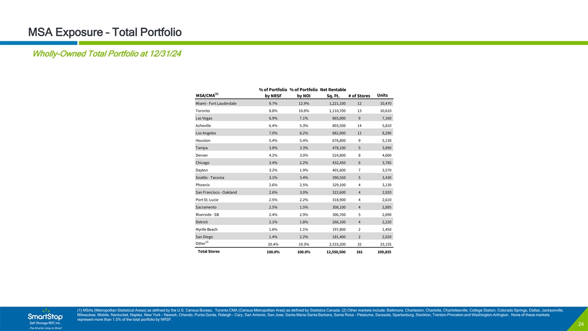C O N F I D E N T I A L MSA Exposure – Same-Store (12 Months Ended) Same-Store Portfolio at 12/31/24 Net Rent / Occupied Sq. Avg. Occupancy for the 12 Expenses for the 12 Ft. for the 12 Months NOI for the 12 Months Months Ended December Revenue for the 12 Months Months Ended December (2) (3) Ended December 31, 31, Ended December 31, 31, Ended December 31, # of Net Rentable (1) MSA/CMA Units 2024 2023 % Change 2024 2023 Change 2024 2023 % Change 2024 2023 % Change 2024 2023 % Change % of NOI Stores Sq. Ft. Miami - Fort Lauderdale 12.5% 11 1,125,900 9,420 $25.46 $25.20 1.0% 92.2% 92.8% -0.6% $24,615 $24,580 0.1% $7,406 $6,663 11.2% $17,208 $17,918 -4.0% (4) Toronto 11.2% 13 1,110,700 10,610 21.09 20.52 2.8% 92.5% 92.7% -0.2% 21,838 21,403 2.0% 6,484 6,484 0.0% 15,354 14,919 2.9% Los Angeles 7.9% 10 660,400 6,200 25.86 25.58 1.1% 91.9% 92.8% -0.9% 15,222 15,262 -0.3% 4,439 4,236 4.8% 10,782 11,027 -2.2% Las Vegas 7.5% 9 865,000 7,160 18.70 18.54 0.9% 93.1% 92.9% 0.2% 13,897 13,783 0.8% 3,612 3,332 8.4% 10,284 10,451 -1.6% Houston 5.4% 9 676,800 5,130 18.63 17.54 6.2% 94.1% 94.1% 0.0% 10,949 10,325 6.0% 3,509 3,535 -0.7% 7,441 6,790 9.6% Asheville 5.4% 12 762,700 5,460 16.10 15.96 0.9% 93.2% 93.4% -0.2% 10,397 10,384 0.1% 2,960 2,984 -0.8% 7,437 7,400 0.5% Seattle - Tacoma 3.5% 5 390,550 3,430 19.99 19.86 0.7% 93.4% 91.6% 1.8% 7,151 6,908 3.5% 2,369 2,201 7.6% 4,783 4,708 1.6% San Francisco - Oakland 3.2% 4 322,600 2,920 23.56 23.76 -0.8% 90.3% 91.3% -1.0% 6,813 6,991 -2.5% 2,471 2,379 3.9% 4,342 4,612 -5.9% Tampa 3.2% 5 478,100 3,890 18.60 19.29 -3.6% 92.7% 92.9% -0.2% 7,230 7,527 -3.9% 2,807 2,588 8.5% 4,423 4,938 -10.4% Riverside - SB 3.1% 5 306,700 2,690 21.60 21.40 0.9% 92.5% 92.7% -0.2% 5,966 5,952 0.2% 1,734 1,646 5.3% 4,232 4,306 -1.7% Denver 2.8% 7 437,300 3,860 17.88 17.00 5.2% 92.5% 93.4% -0.9% 7,176 6,850 4.8% 3,270 3,133 4.4% 3,906 3,717 5.1% Phoenix 2.7% 4 329,100 3,130 17.38 17.83 -2.5% 92.5% 92.1% 0.4% 5,303 5,420 -2.2% 1,653 1,561 5.9% 3,650 3,859 -5.4% Chicago 2.5% 6 432,450 3,785 15.55 15.22 2.2% 91.9% 92.1% -0.2% 6,272 6,096 2.9% 2,887 2,496 15.6% 3,385 3,599 -6.0% Port St. Lucie 2.3% 4 318,900 2,610 19.64 20.25 -3.0% 92.6% 93.3% -0.7% 5,053 5,186 -2.5% 1,845 1,717 7.4% 3,208 3,468 -7.5% Dayton 2.0% 7 401,600 3,570 12.61 12.50 0.9% 86.9% 93.6% -6.7% 4,482 4,489 -0.1% 1,754 1,686 4.0% 2,729 2,803 -2.6% Detroit 1.9% 4 266,100 2,220 15.66 15.35 2.0% 93.2% 94.0% -0.8% 3,712 3,683 0.8% 1,099 1,052 4.4% 2,613 2,630 -0.6% Other 22.9% 33 2,544,200 22,770 20.35 20.31 0.2% 91.8% 92.8% -1.0% 46,448 46,889 -0.9% 15,001 14,423 4.0% 31,447 32,467 -3.1% Total Same-Store 100.0% 148 11,429,100 98,855 $20.02 $19.83 1.0% 92.2% 92.9% -0.7% $202,523 $201,728 0.4% $65,301 $62,115 5.1% $137,222 $139,613 -1.7% Note: Data presented represents SmartStop’s existing owned same-store portfolio only (1) MSAs (Metropolitan Statistical Areas) as defined by the U.S. Census Bureau. Toronto CMA (Census Metropolitan Area) as defined by Statistics Canada. (2) RentPOF defined as annualized rental revenue net of discounts & concessions, excluding late fees, administrative fees and parking income, divided by occupied square feet of storage. Not in thousands. (3) NOI is a non-GAAP measure. See Appendix for a reconciliation of this measure to the most directly comparable GAAP measure. (4) Presented in US Dollars (USD) as translated on average for the quarter. The average USD/CAD exchange rate for the 12 months ending December 31, 2024 and December 31, 2023 was 0.73x and 0.74x, respectively. 23