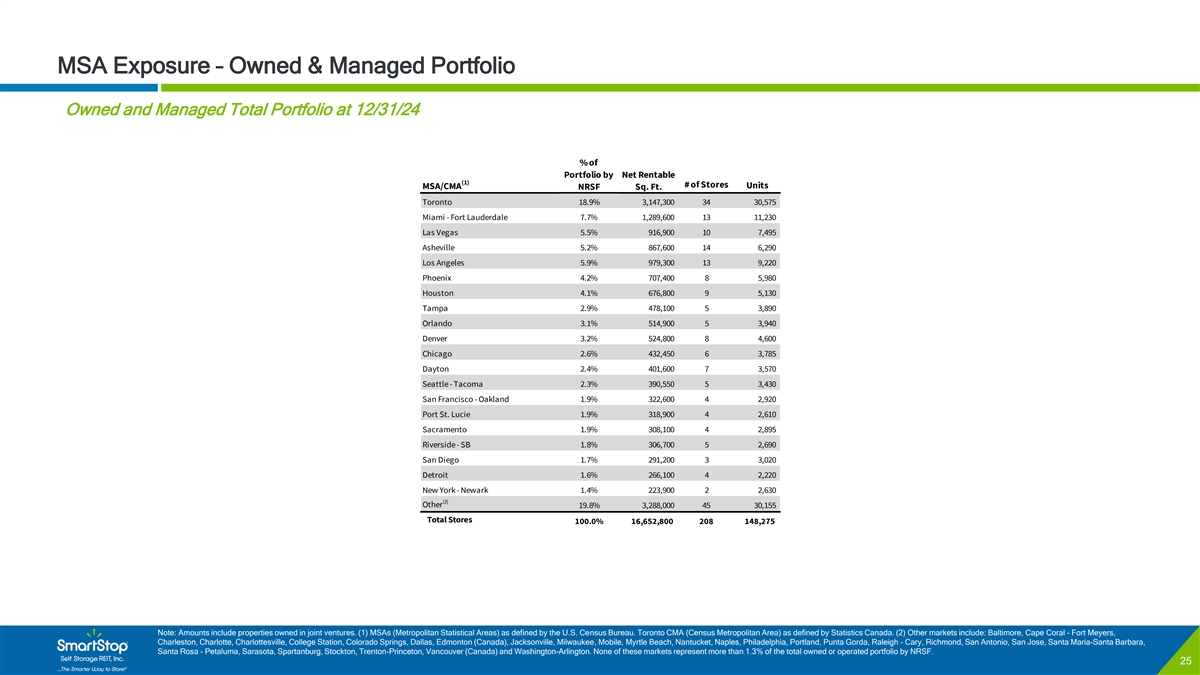 C O N F I D E N T I A L MSA Exposure – Total Portfolio Wholly-Owned Total Portfolio at 12/31/24 % of Portfolio % of Portfolio Net Rentable (1) MSA/CMA Units by NRSF by NOI Sq. Ft. # of Stores Miami - Fort Lauderdale 9.7% 12.9% 1, 221,100 12 10,470 Toronto 8.8% 10.8% 1,110,700 13 10,610 Las Vegas 6.9% 7.1% 865,000 9 7,160 Asheville 6.4% 5.3% 803,500 14 5,810 Los Angeles 7.0% 8.2% 882,000 12 8,290 Houston 5.4% 5.4% 67 6,800 9 5,130 Tampa 3.8% 3.3% 478,100 5 3,890 Denver 4.2% 3.0% 524,800 8 4,600 Chicago 3.4% 2.2% 432,450 6 3,785 Dayton 3.2% 1.9% 40 1,600 7 3,570 Seattle - Tacoma 3.1% 3.4% 39 0,550 5 3,430 Phoenix 2.6% 2.5% 329,100 4 3,130 San Francisco - Oakland 2.6% 3.0% 322,600 4 2,920 Port St. Lucie 2.5% 2.2% 318,900 4 2,610 Sacramento 2.5% 1.5% 308,100 4 2,895 Riverside - SB 2.4% 2.9% 306,700 5 2,690 Detroit 2.1% 1.8% 26 6,100 4 2,220 Myrtle Beach 1.6% 1.1% 197,800 2 1,450 San Diego 1.4% 2.2% 18 1,400 2 2,020 (2) Other 20.4% 19.3% 2,533,200 32 23,155 Total Stores 100.0% 100.0% 1 2,550,500 161 109,835 (1) MSAs (Metropolitan Statistical Areas) as defined by the U.S. Census Bureau. Toronto CMA (Census Metropolitan Area) as defined by Statistics Canada. (2) Other markets include: Baltimore, Charleston, Charlotte, Charlottesville, College Station, Colorado Springs, Dallas, Jacksonville, Milwaukee, Mobile, Nantucket, Naples, New York - Newark, Orlando, Punta Gorda, Raleigh - Cary, San Antonio, San Jose, Santa Maria-Santa Barbara, Santa Rosa - Petaluma, Sarasota, Spartanburg, Stockton, Trenton-Princeton and Washington-Arlington . None of these markets represent more than 1.5% of the total portfolio by NRSF. 24