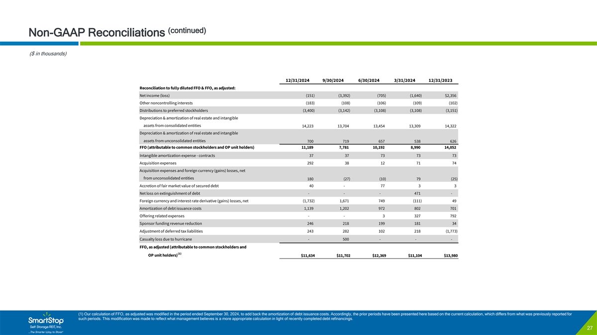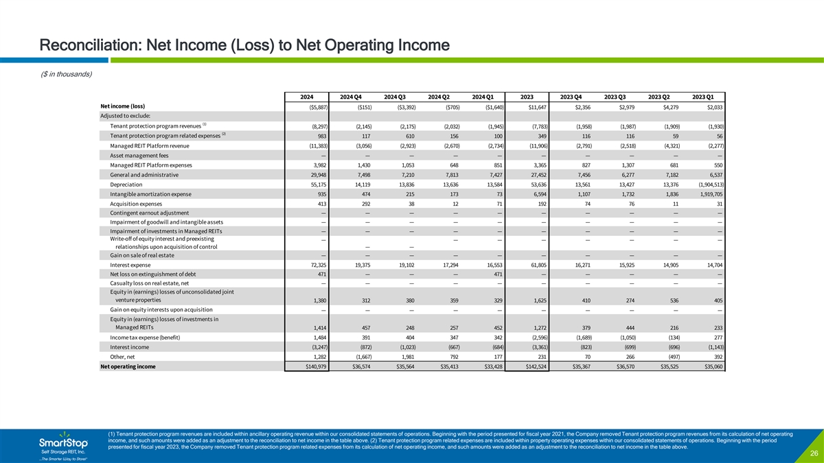 C O N F I D E N T I A L Reconciliation: Net Income (Loss) to Net Operating Income ($ in thousands) 2024 2024 Q4 2024 Q3 2024 Q2 2024 Q1 2023 2023 Q4 2023 Q3 2023 Q2 2023 Q1 Net income (loss) ($5,887) ($151) ($3,392) ($705) ($1,640) $11,647 $2,356 $2,979 $4,279 $2,033 Adjusted to exclude: (1) Tenant protection program revenues (8,297) ( 2,145) (2,175) (2,032) ( 1,945) ( 7,783) ( 1,958) (1,987) (1,909) ( 1,930) (2) Tenant protection program related expenses 983 117 610 156 100 349 116 116 59 56 Managed REIT Platform revenue ( 11,383) ( 3,056) (2,923) ( 2,670) (2,734) ( 11,906) (2,791) (2,518) (4,321) (2,277) Asset management fees — — — — — — — — — — Managed REIT Platform expenses 3,982 1 ,430 1,053 648 851 3 ,365 827 1,307 681 550 General and administrative 2 9,948 7,498 7,210 7,813 7,427 2 7,452 7,456 6,277 7,182 6,537 Depreciation 55,175 14,119 13,836 13,636 13,584 53,636 13,561 13,427 13,376 (1,904,513) Intangible amortization expense 935 474 215 173 73 6 ,594 1,107 1,732 1,836 1 ,919,705 Acquisition expenses 413 292 38 12 71 192 74 76 11 31 Contingent earnout adjustment — — — — — — — — — — Impairment of goodwill and intangible assets — — — — — — — — — — Impairment of investments in Managed REITs — — — — — — — — — — Write-off of equity interest and preexisting — — — — — — — — relationships upon acquisition of control — — Gain on sale of real estate — — — — — — — — — — Interest expense 7 2,325 1 9,375 1 9,102 17,294 16,553 6 1,805 16,271 1 5,925 14,905 14,704 Net loss on extinguishment of debt 471 — — — 471 — — — — — Casualty loss on real estate, net — — — — — — — — — — Equity in (earnings) losses of unconsolidated joint venture properties 1 ,380 312 380 359 329 1 ,625 410 274 536 405 Gain on equity interests upon acquisition — — — — — — — — — — Equity in (earnings) losses of investments in Managed REITs 1 ,414 457 248 257 452 1,272 379 444 216 233 Income tax expense (benefit) 1 ,484 391 404 347 342 (2,596) ( 1,689) (1,050) ( 134) 277 Interest income (3,247) ( 872) (1,023) (667) (684) (3,361) (823) (699) (696) (1,143) Other, net 1 ,282 (1,667) 1,981 792 177 231 70 266 (497) 392 Net operating income $140,979 $36,574 $35,564 $35,413 $33,428 $142,524 $35,367 $36,570 $35,525 $35,060 (1) Tenant protection program revenues are included within ancillary operating revenue within our consolidated statements of operations. Beginning with the period presented for fiscal year 2021, the Company removed Tenant protection program revenues from its calculation of net operating income, and such amounts were added as an adjustment to the reconciliation to net income in the table above. (2) Tenant protection program related expenses are included within property operating expenses within our consolidated statements of operations. Beginning with the period presented for fiscal year 2023, the Company removed Tenant protection program related expenses from its calculation of net operating income, and such amounts were added as an adjustment to the reconciliation to net income in the table above. 26