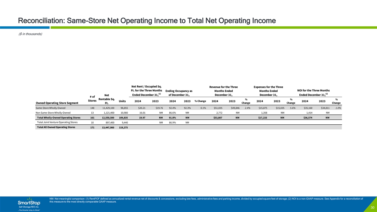 C O N F I D E N T I A L Reconciliation: Same-Store Net Operating Income to Total Net Operating Income ($ in thousands) Net Rent / Occupied Sq. Revenue for the Three Expenses for the Three Ft. for the Three Months NOI for the Three Months Ending Occupancy as Months Ended Months Ended (1) (2) Ended December 31, of December 31, December 31, December 31, Ended December 31, Net # of Rentable Sq. % % % Stores Units 2024 2023 2024 2023 % Change 2024 2023 2024 2023 2024 2023 Change Change Change Owned Operating Store Segment Ft. Same-Store Wholly-Owned 148 11,429,100 98,855 $20.21 $19.76 92.4% 92.3% 0.1% $51,035 $49,846 2.4% $15,875 $15,035 5.6% $35,160 $34,811 1.0% Non Same-Store Wholly-Owned 13 1,121,400 10,980 16.01 NM 86.6% NM 2,772 NM 1,358 NM 1,414 NM Total Wholly-Owned Operating Stores 161 12,550,500 109,835 19.97 NM 91.8% NM $53,807 NM $17,233 NM $36,574 NM Total Joint Venture Operating Stores 10 897,400 9,440 NM 86.9% NM Total All Owned Operating Stores 171 13,447,900 119,275 NM: Not meaningful comparison (1) RentPOF defined as annualized rental revenue net of discounts & concessions, excluding late fees, administrative fees and parking income, divided by occupied square feet of storage; (2) NOI is a non-GAAP measure. See Appendix for a reconciliation of this measure to the most directly comparable GAAP measure. 30