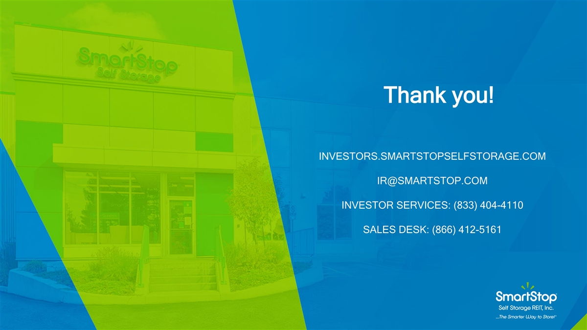 Thank you! INVESTORS.SMARTSTOPSELFSTORAGE.COM IR@SMARTSTOP.COM INVESTOR SERVICES: (833) 404-4110 SALES DESK: (866) 412-5161
