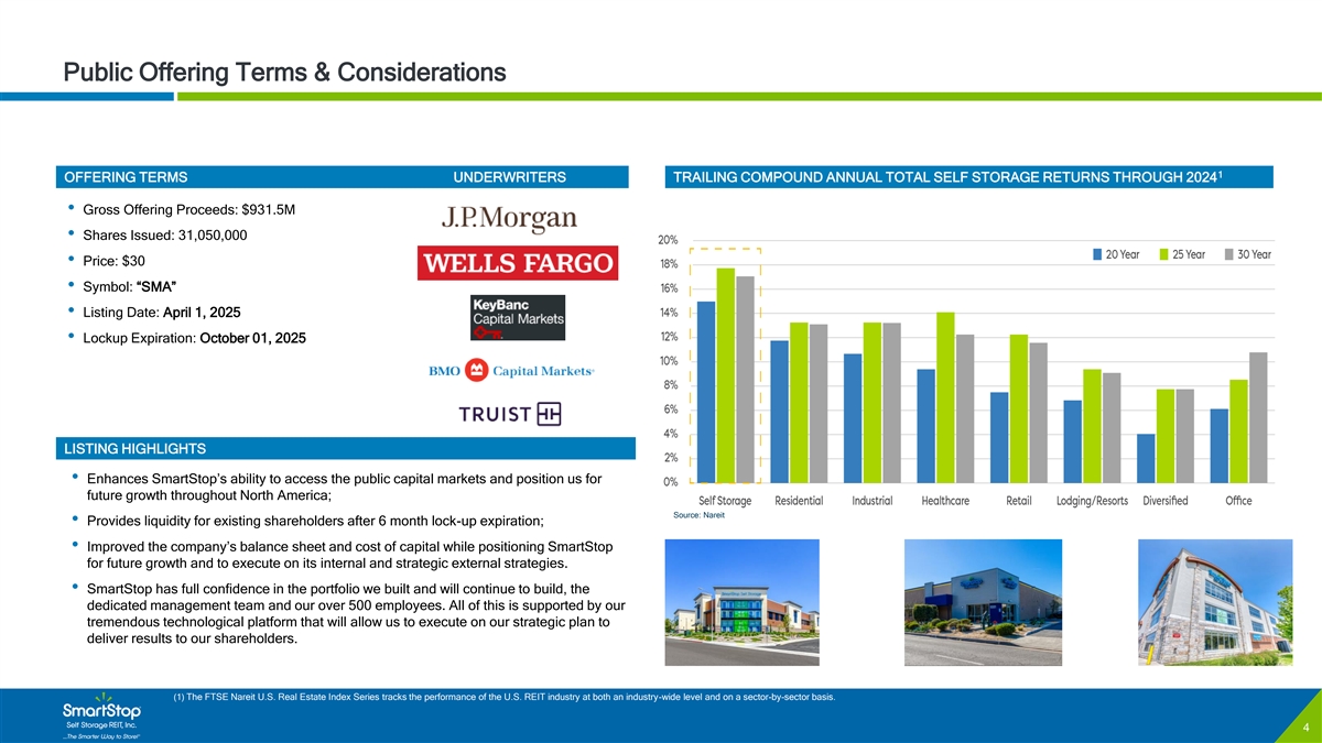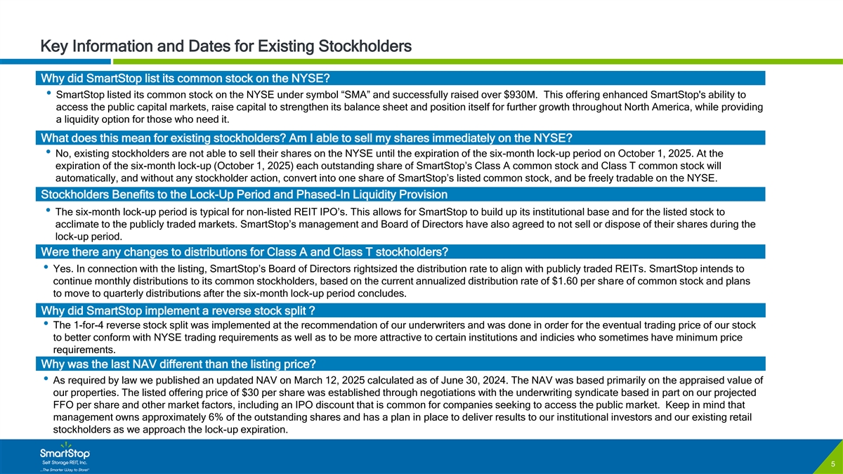 C O N F I D E N T I A L Public Offering Terms & Considerations 1 OFFERING TERMS UNDERWRITERS TRAILING COMPOUND ANNUAL TOTAL SELF STORAGE RETURNS THROUGH 2024 • Gross Offering Proceeds: $931.5M • Shares Issued: 31,050,000 • Price: $30 • Symbol: “SMA” • Listing Date: April 1, 2025 • Lockup Expiration: October 01, 2025 LISTING HIGHLIGHTS • Enhances SmartStop’s ability to access the public capital markets and position us for future growth throughout North America; Source: Nareit • Provides liquidity for existing shareholders after 6 month lock-up expiration; • Improved the company’s balance sheet and cost of capital while positioning SmartStop for future growth and to execute on its internal and strategic external strategies. • SmartStop has full confidence in the portfolio we built and will continue to build, the dedicated management team and our over 500 employees. All of this is supported by our tremendous technological platform that will allow us to execute on our strategic plan to deliver results to our shareholders. (1) The FTSE Nareit U.S. Real Estate Index Series tracks the performance of the U.S. REIT industry at both an industry-wide level and on a sector-by-sector basis. 4