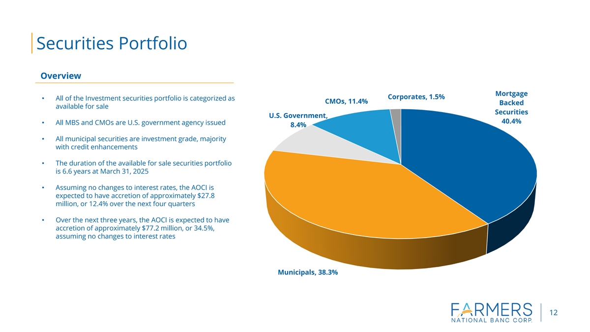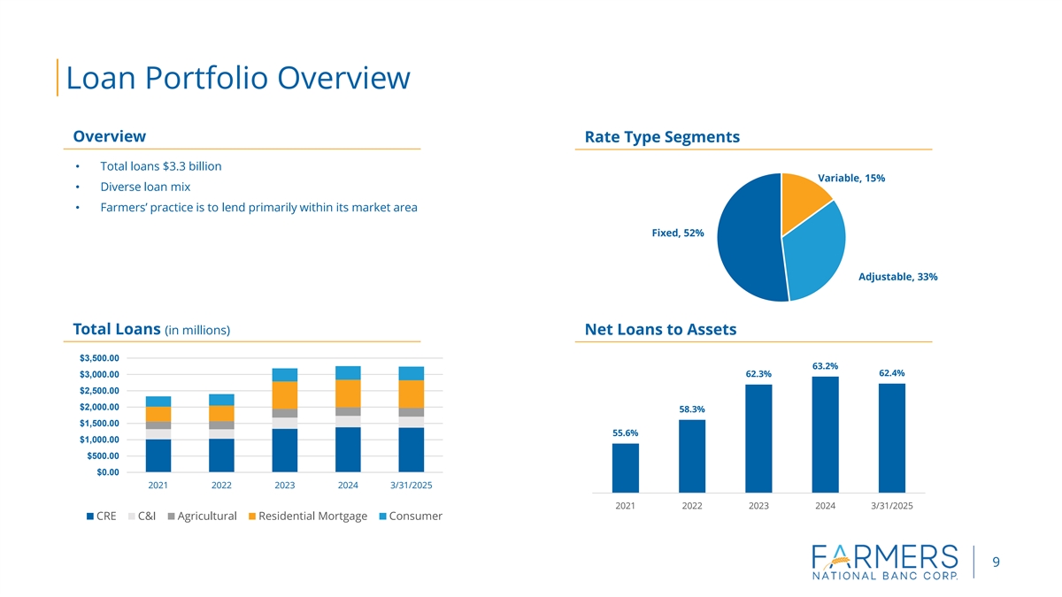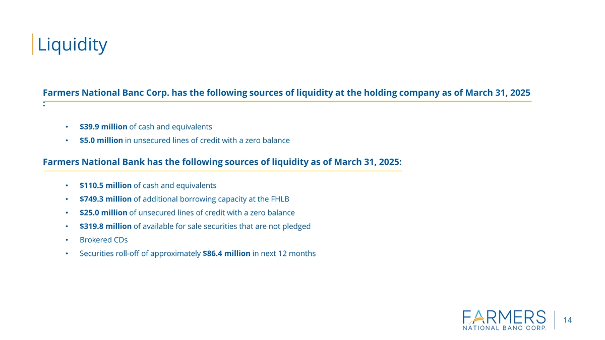 総資産は2025年第1四半期に3,810万ドル増加し、2024年12月31日現在の51億2,000万ドルから51億6,000万ドルとなった。貸出金は、2024年12月31日時点の32.7億ドルから2025年3月31日時点では32.5億ドルと、若干減少しました。前四半期からの減少は、主にC&IおよびCRE貸出が減少したことによるものです。第2四半期のパイプラインは現在のところ改善を示していますが、関税の導入により、借り手の意思決定に不確実性が増しています。