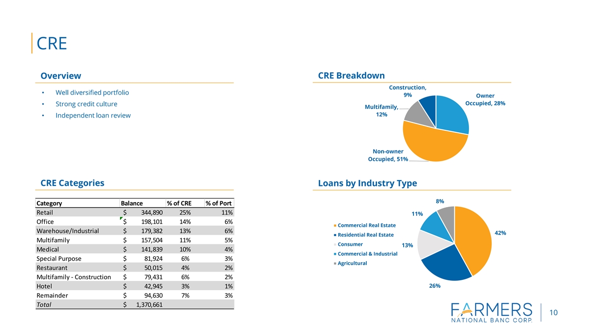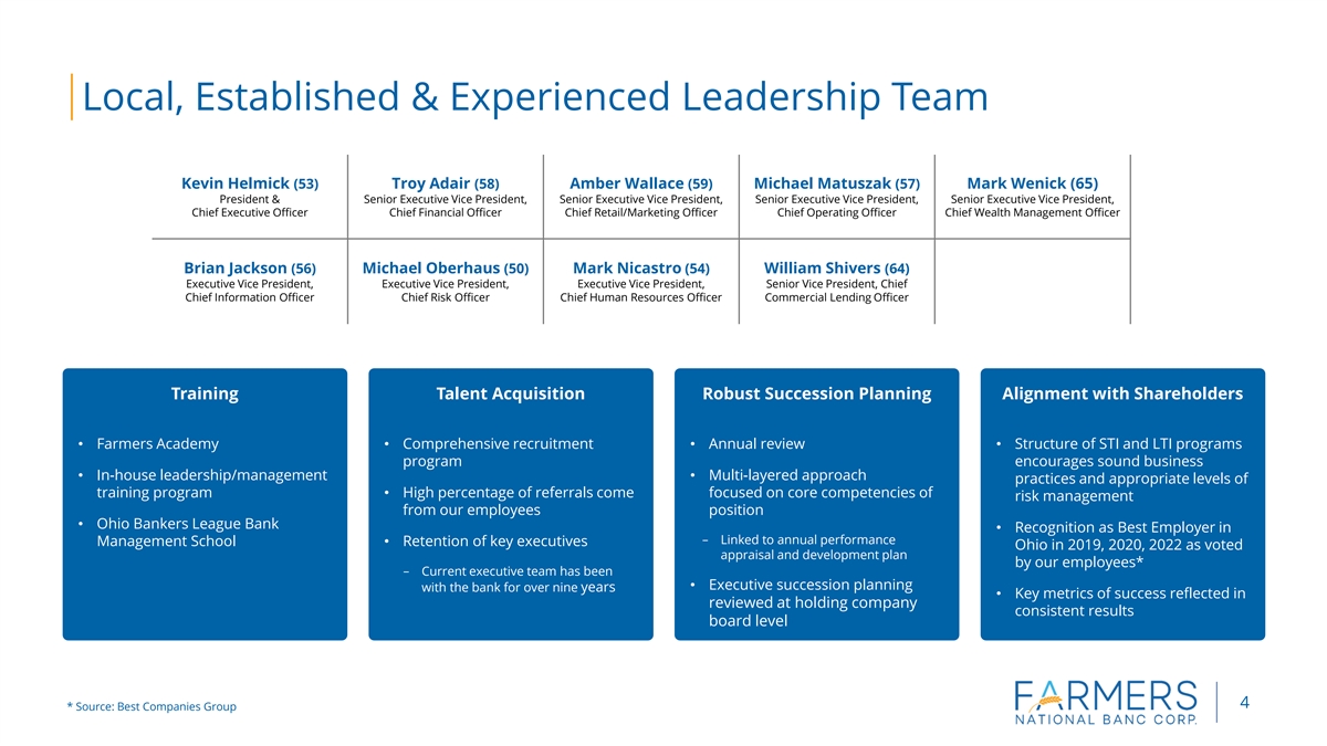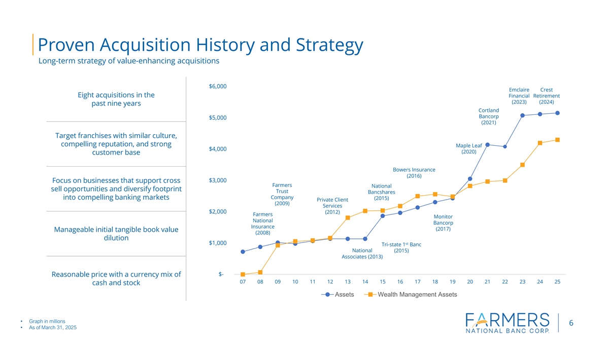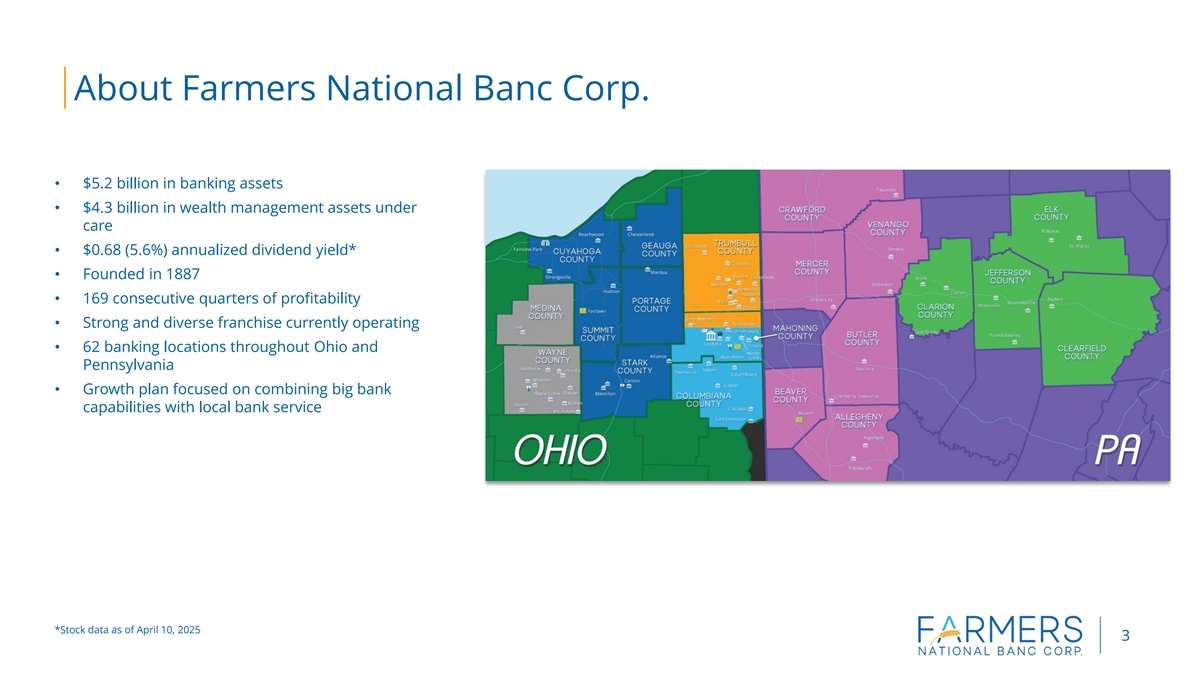 1887年設立のファーマーズ・ナショナル・バンク・コーポレーションは、オハイオ州キャンフィールドに本社を置く多角的金融サービス企業で、銀行資産は52億ドルに上る。ファーマーズ・ナショナル・バンク・コーポレーションの完全所有子会社は、ファーマーズ・ナショナル・バンク、ファーマーズ・ナショナル・バンク、ファーマーズ・ナショナル・バンク、ファーマーズ・ナショナル・バンク、ファーマーズ・ナショナル・バンク、ファーマーズ・ナショナル・バンク。ファーマーズ・ナショナル・バンク・オブ・キャンフィールドは、マホニング、トランブル、コロンビアーナ、ポーテージ、スターク、ウェイン、メディナ、ゲーガ、カイヤホガに62の支店を持ち、商業およびリテール・バンキングを行うフルサービスの全国銀行である、オハイオ州マホニング、トランブル、コロンビアーナ、ポーテージ、スターク、ウェイン、メディナ、ジョージア、カイヤホガ郡、ペンシルベニア州ビーバー、バトラー、アレゲニー、ジェファーソン、クラリオン、ヴェナンゴ、クリアフィールド、マーサー、エルク、クロフォード郡に62の銀行拠点を持つ商業・リテール銀行。2025年3月31日現在の運用資産総額は43億ドル。キャンフィールドのファーマーズ・ナショナル・バンクの完全子会社であるファーマーズ・ナショナル・インシュアランスLLCは、様々な保険商品を提供している。